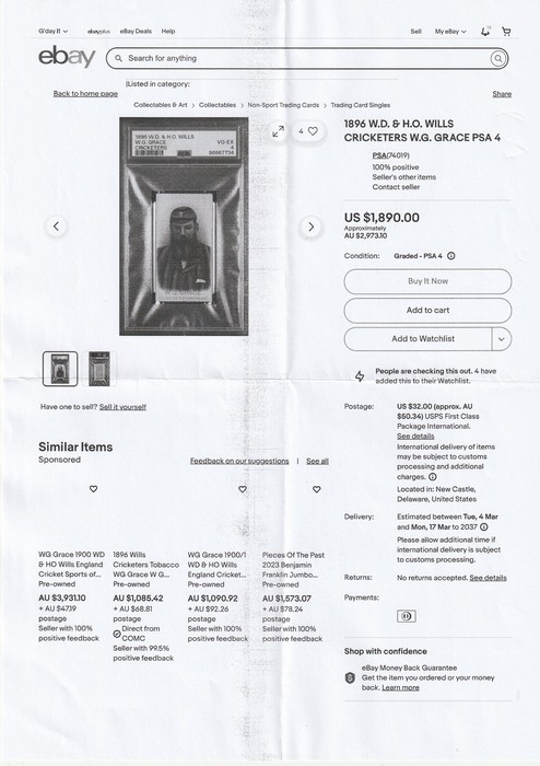 3847 imageCricket: 1897 WG Grace Wills full colour card. Fine. Estimated current retail $1000-$1500. (P) (Image1) (Image2) (Image3)