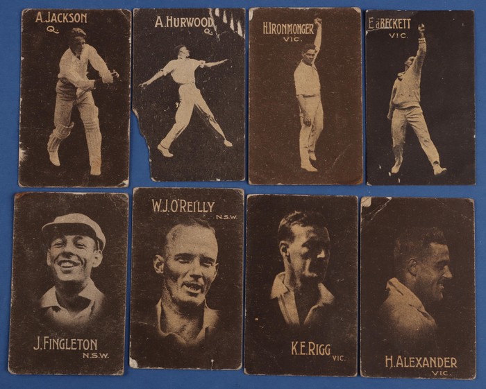 Trade Cards: Australian Licorice Company 1931 set of 24, giant backs) inc Bradman, Darling, Kippax, Grimmett, Oldfield, Ponsford, Richardson, O'Reilly & Woodfil. Mostly F-VF condition (Hurwood missing LL cnr), scarce as a comp set. UK cat £15
