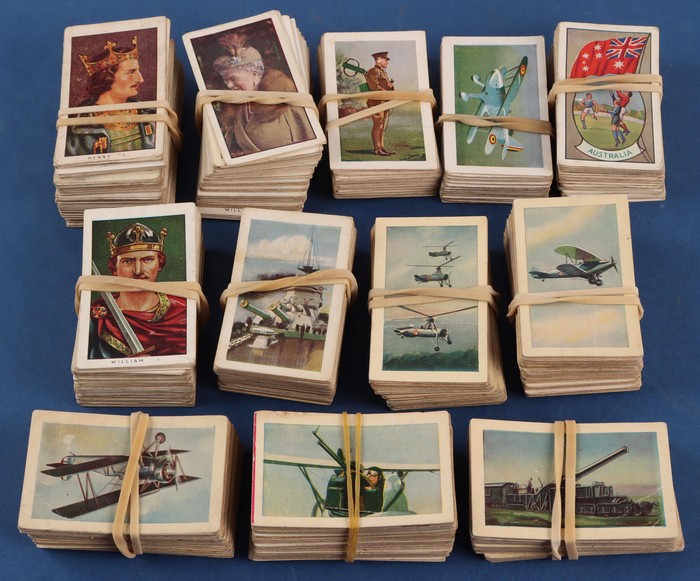 Australia 1930s Allens Confectionery accumulation with Defence 1st series (180), Defence 2nd series (220), Fighter Planes (50), Kings & Queens of England (260), Soldiers of the Empire (45) plus Sports & Flags of Nations (65). Mostly F-VF. CTCC cat