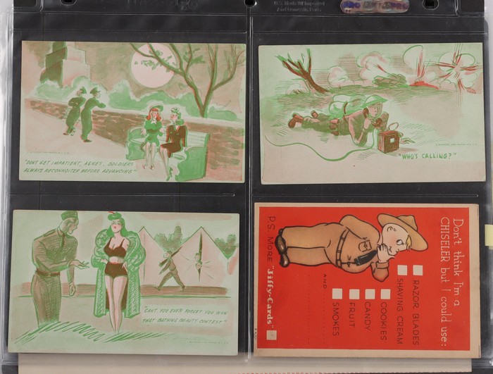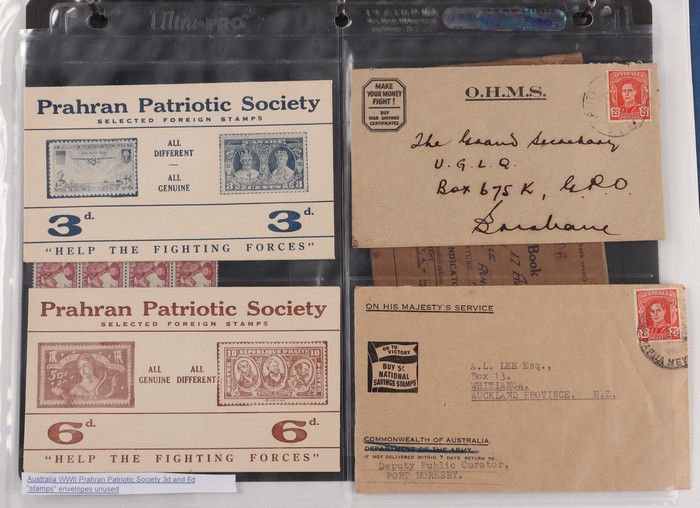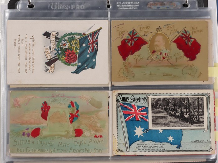 Christmas/New Year real photo Greetings (2). Edwardian era Patriotics, USA WWII Comics plus others. WWI era blank unused Dardanelles lettersheet. c1916 Paid Letters for POW Camp Australia (2), used with endorsements. Victoria 1940s Petrol Rationing