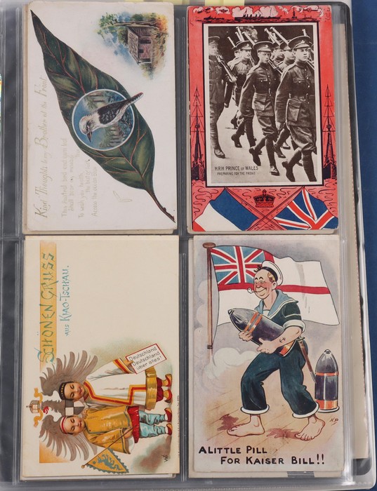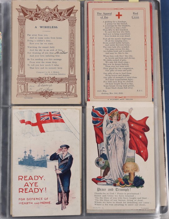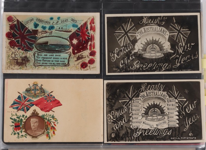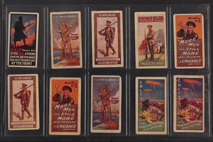 inc Cigarette Cards with 1915 WWI Recruiting Posters (10 mixed, cat £100) inc A Call from the Dardanelles (2), 1919 metallic 'brass' Postcard made from scrap shell case engraved '48 Batt A.I.F.' at left. Other PPC (32) inc WWI Rising Sun