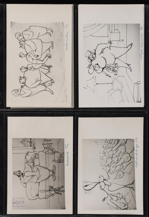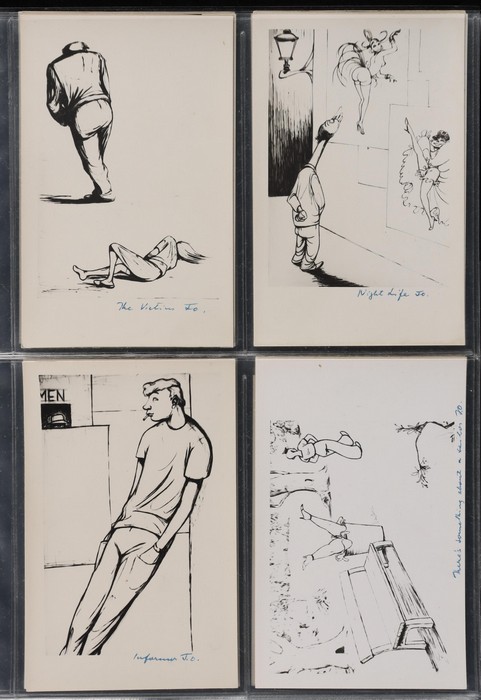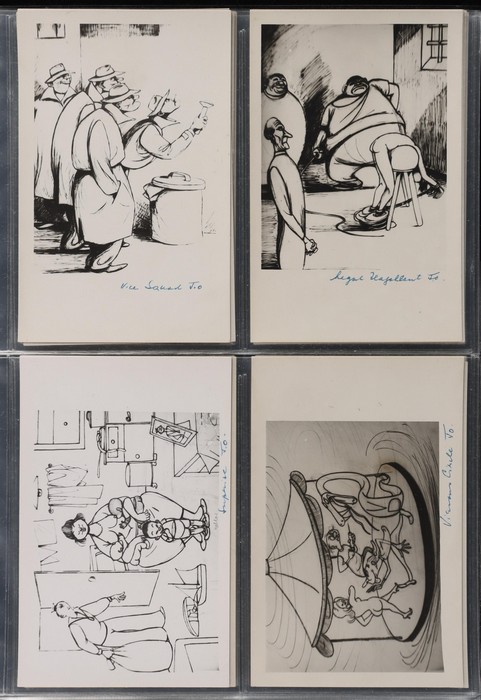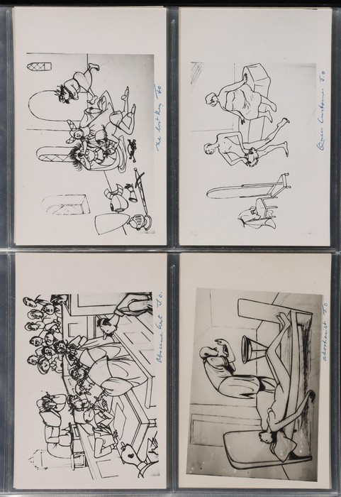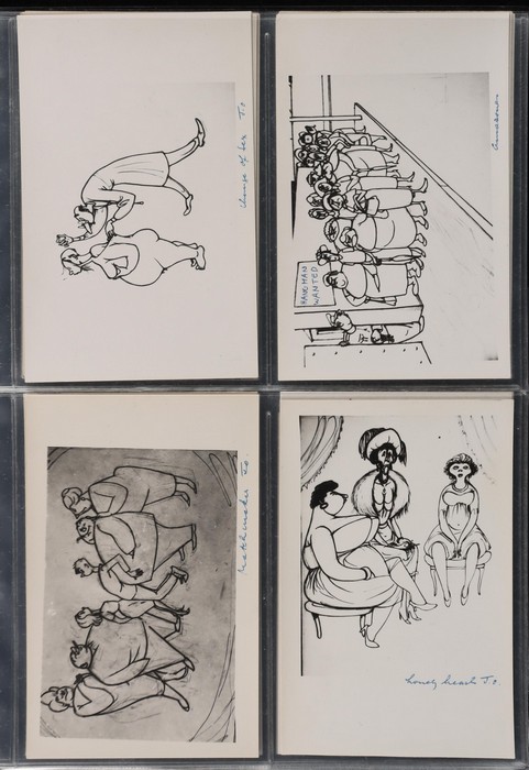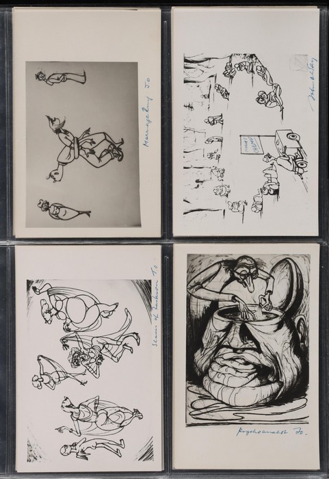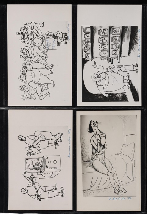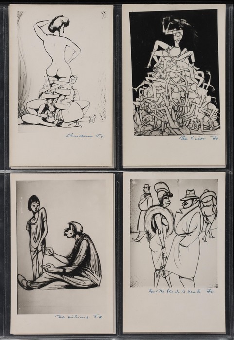 series of privately produced artists cards being monochrome cartoons reflecting on his life of political activism, social/sexual mores, medical practices etc, all with hand-written inscriptions & initialled 'JO', superb unused; plus 2 flyers for his