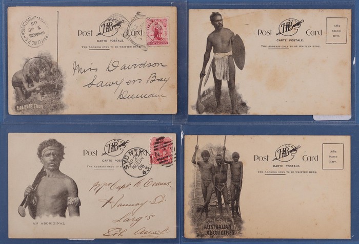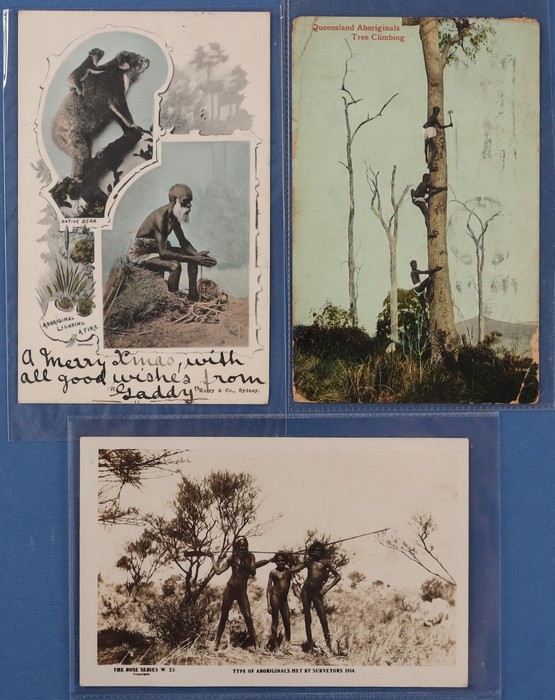 Aborigine cards early 1900s group (6) with Queensland Aborigines Climbing a Tree, Kerry & Co Aboriginal Lighting a Fire, HB Sydney PPC (4) all with diff Aborigine reverses plus 1930s B&W Commonwealth Railways real photo PPC Type of Aborigine. Then