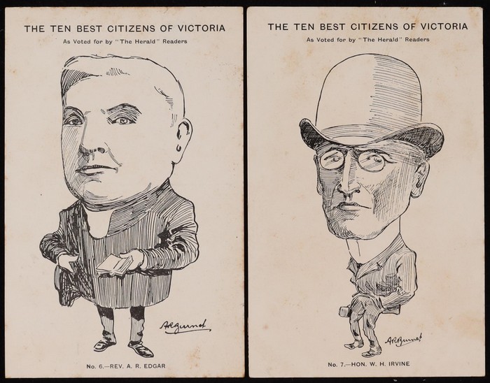 AR Buret 'The Ten Best Citizens of Victoria' group of 6 (numbered) inc Sir John Madden (No 1), Sir George Turner (No 4), Hon WH Irvine (No 7) & Hon George Coppin (No 10). Some minor foxing, F-VF condition. (6) (Image1) (Image2)