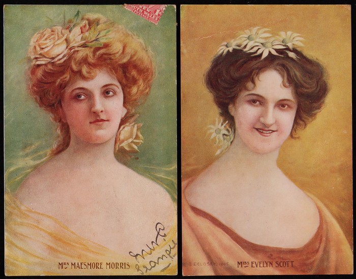 E T De Closay 'Glamour' group of Eight with 'Fairy Butterfly', 'Australian Beauty' (2), Actresses (4) inc Miss Maud Jeffries & Miss Evelyn Scott. 'Heraldic' with Queensland Shield. Mixed UN/U, generally F condition. (8) (Image1) (Image2)