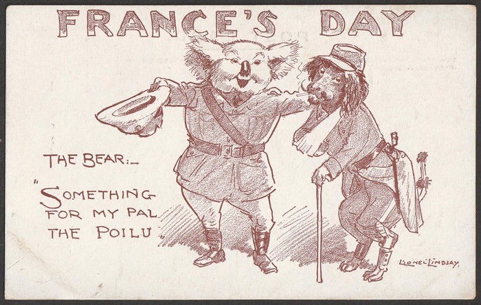 Lionel Lindsay 'France's Day' featuring Koala in military uniform. LL cnr creased. F-VF UN. (Image1) (Image2)
