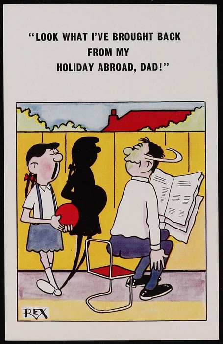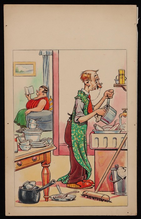Comic Cards: 1950s original artwork selection (7) inc 'Look what I've brought back from my holiday abroad Dad!' plus Proof card with 'Dis-Approved' cachet on reverse. Then another 6 original artworks plus issued cards inc 'No Madam ?', 'As you are