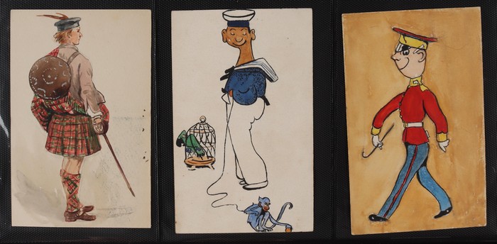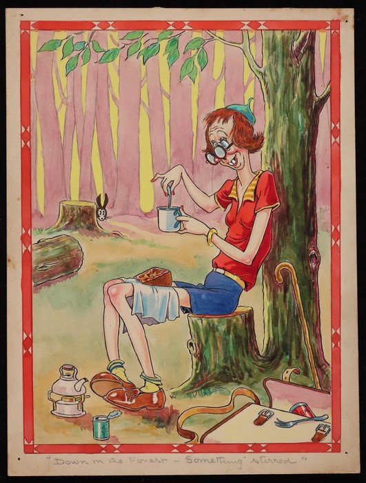 Comic cards 1930s original artwork selection with 1935 Dudley Buxton (unsigned) water colour depicting hiker titled 'Down in the Forest Something Stirred' plus Proof card with Isle of Man 'Dis-Approved for Sale' cachet on reverse. Also another 2