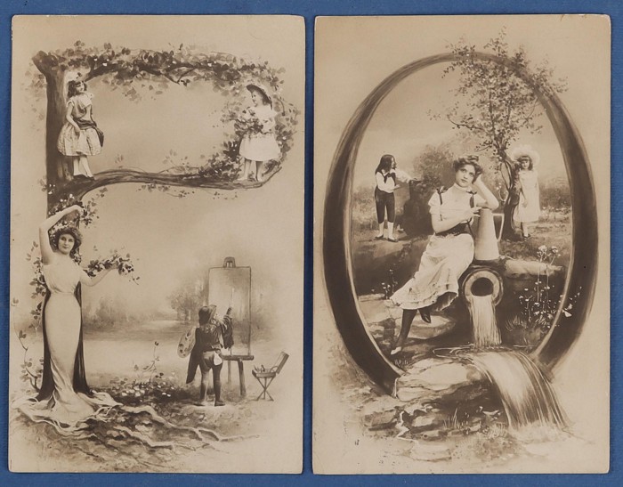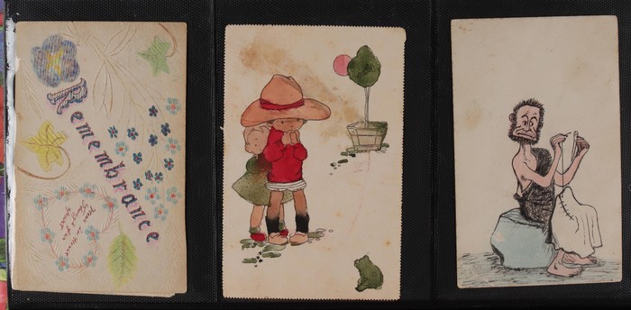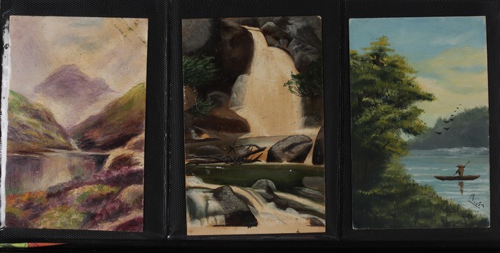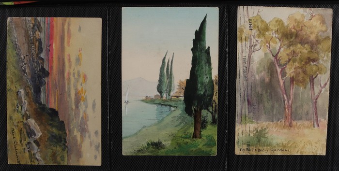 collection in album of mostly watercolours plus some pen & ink types ranging from the primitive & na?ve to the highly skilled & beautiful, mostly British or European but some Australian subjects noted, some postally used, facially generally F-VF.