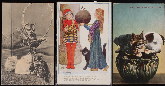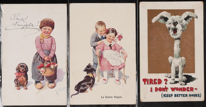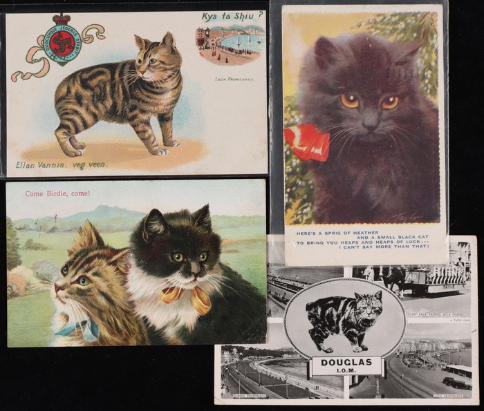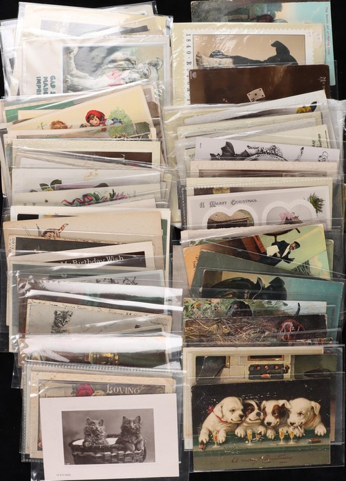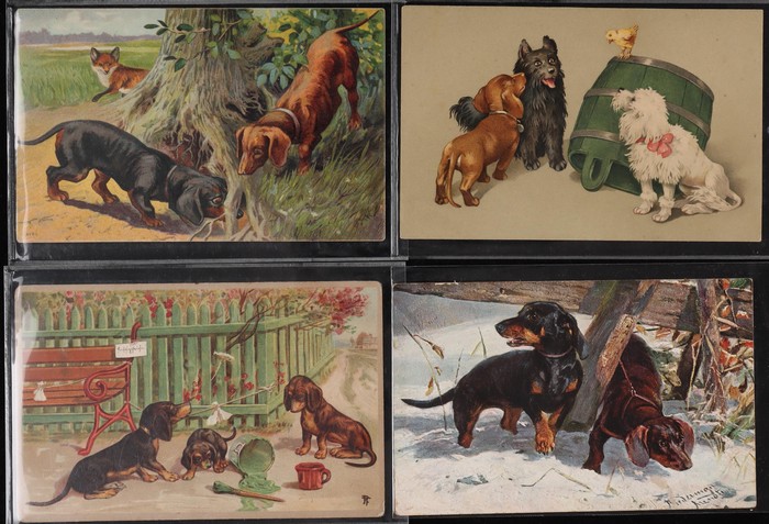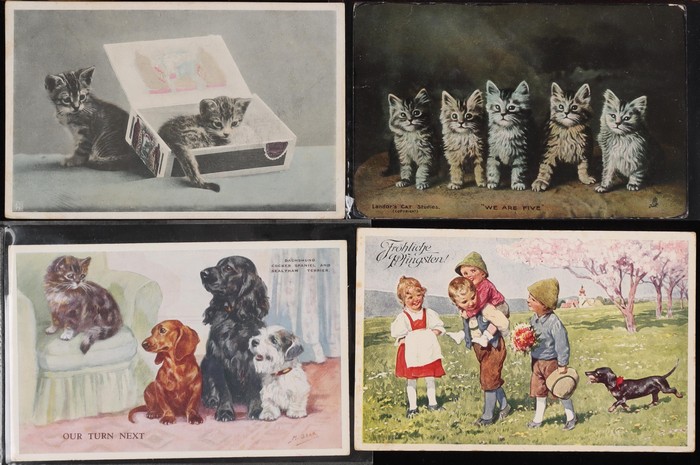 Collection of 25 diff cats, mostly pre-1910, mostly Moggies with Manx cats sighted. Dogs (85) with good variety inc Dachshunds, Terriers, Collies, Spaniels & others. Again nearly all pre-1910. Generally F-VF. Another difficult assembly. (110) (Image1) (Image2)