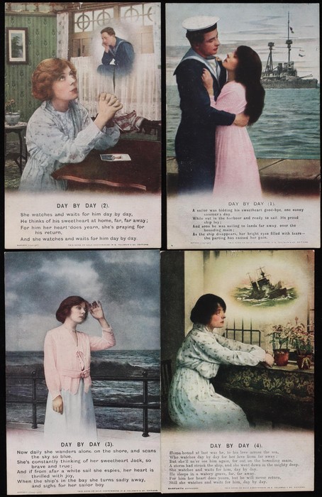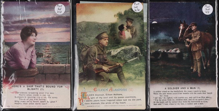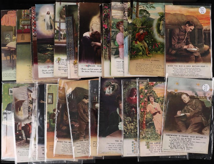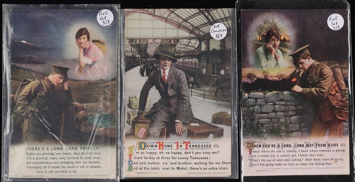 Military related. Great Britain: Bamforth Songs collection (115) inc 22 diff comp sets, plus odds & extras. Difficult assembly inc WWI Separation themes, Religion & Romance. Mostly VF UN. (Image1) (Image2)