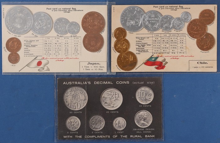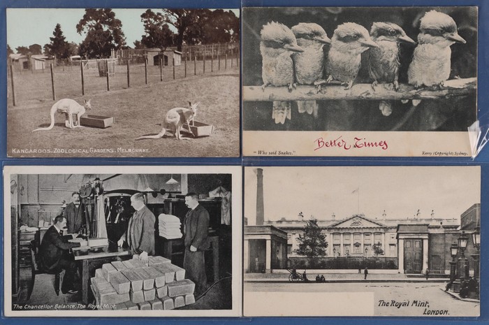 Koalas, Kangaroos, Camels, Horses, Kookaburras, Owls & more. Churches/Cathedrals (30). Coins/Banknotes (20) inc Royal Mint Views (12). Zieher coin cards for Chile & Japan plus Australia 1966 decimal set. Also European 1940s-50s Medal Cards (25), Cars