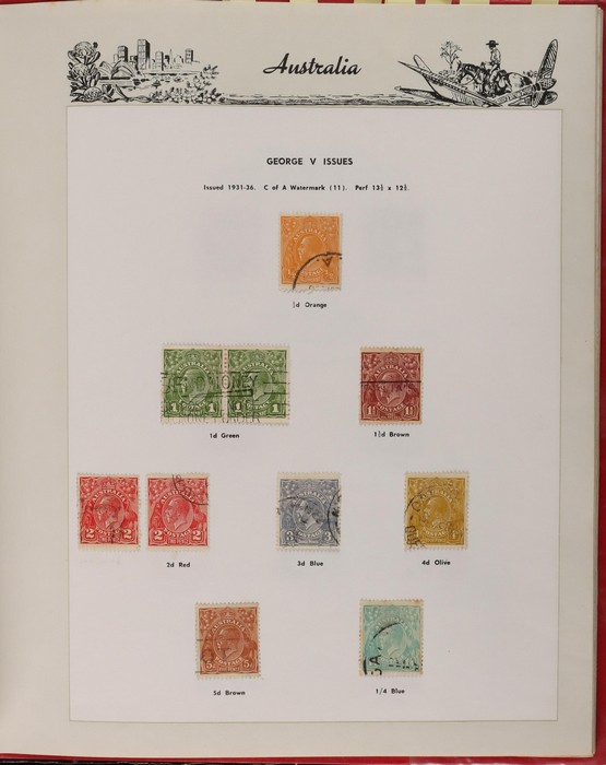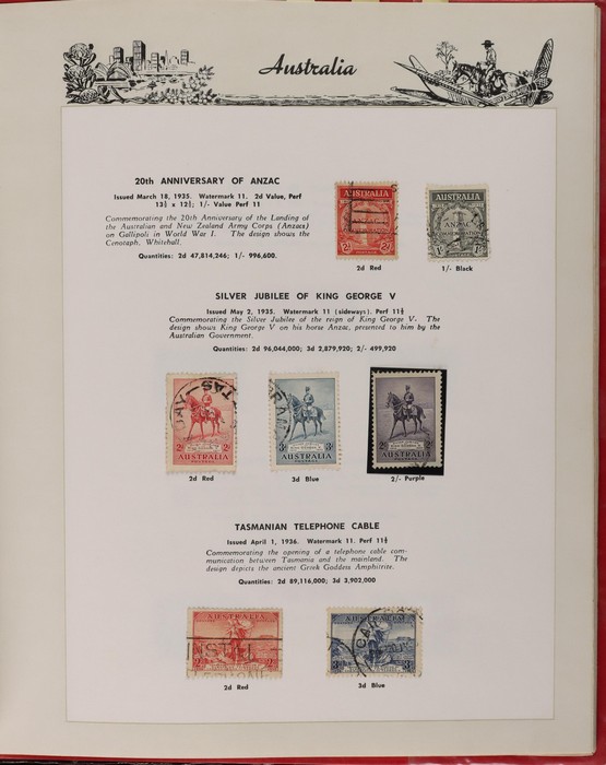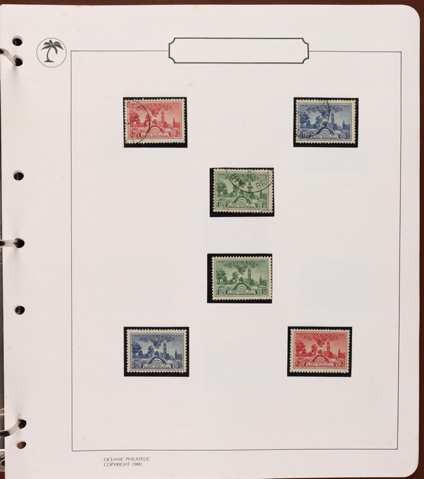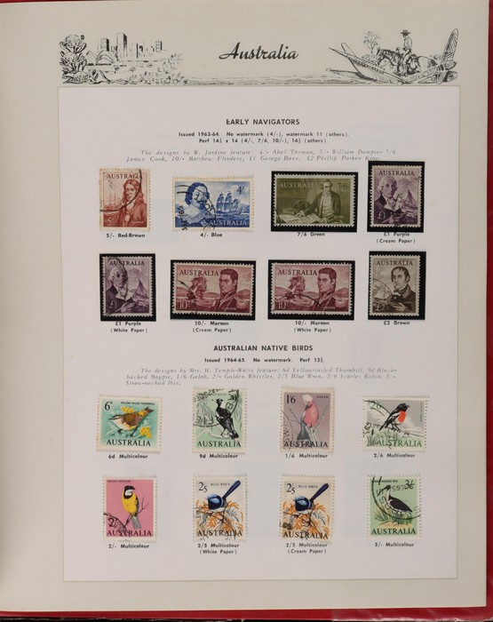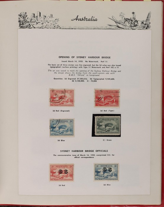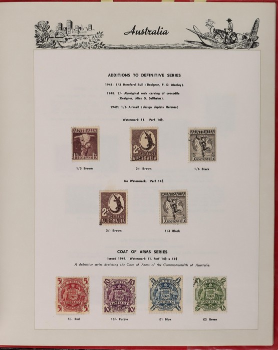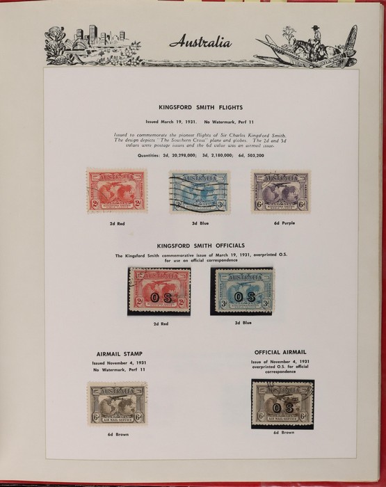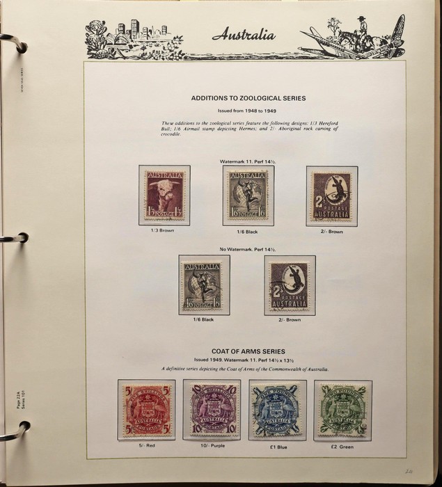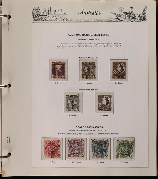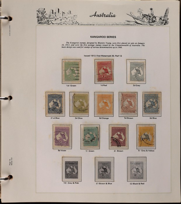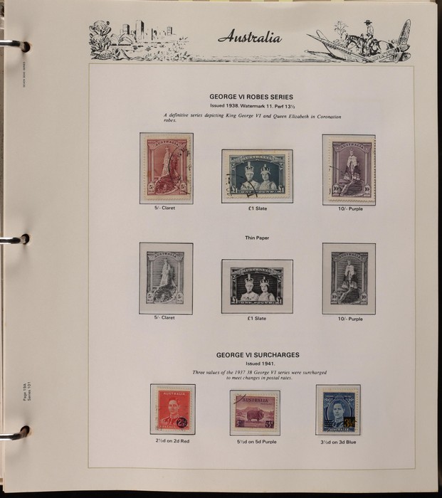 386 image1913-75 near comp collection in Seven Seas hingeless album with Kangaroos 1st wmk to 2/-, 2nd wmk to 2/-, 3rd wmk to 2/- brown, SM wmk to 5/- & CofA wmk to 5/- inc 6d opt OS, plus 10/-, £1, £2 opt SPECIMEN. KGV comp (retail $750) inc single wmk 1d Die III & 4d lemon, SM wmk perf 14 to 1/4, 1d green Die II, 4½d violet Die II & opt OS set to 5d. 1914 Kookaburra 6d Engraved. 1928 Kookaburra 3d M/Sheet with pale Exhibition cancel. 1931-32 OS opt set of 6 to 1/- inc Kingsford Smith 2d, 3d. 1932 Bridge set to 5/- & all other 1930s high val Commem sets F-VFU. 1937 Robes to £1 thick & thin papers. 1949 Arms set to £2. 1953-75 QEII comp inc 1964 Navigator set of 8 to £2 King, 1966 Defs to $4 Navigator, 1974 Paintings to $10 & all other Pic/Commem sets inc 1971 Christmas 7c blk of 25. A well balanced, neat, mostly F-VFU collection, nicer than most. ACSC cat/retail $4800. (670+) (P) (Image1) (Image2) (Image3) (Image4) (Image5) (Image6) (Image7) (Image8) (Image9) (Image10) (Image11) (Image12) (Image13) (Image14) (Image15) (Image16) (Image17) (Image18) (Image19) (Image20) (Image21)