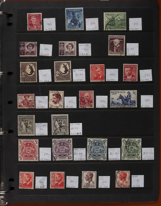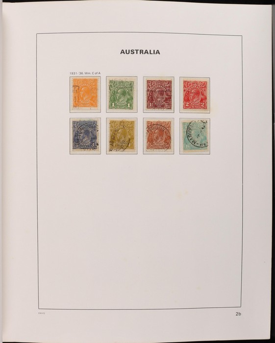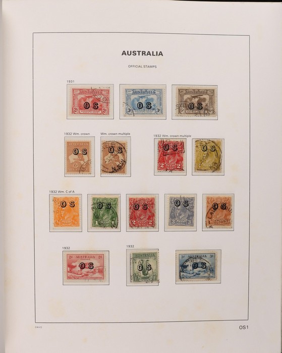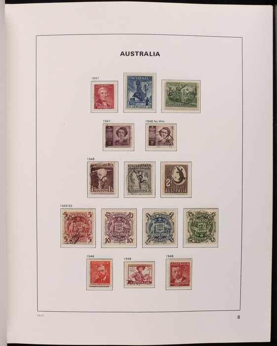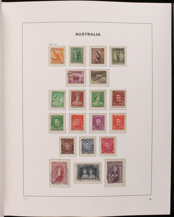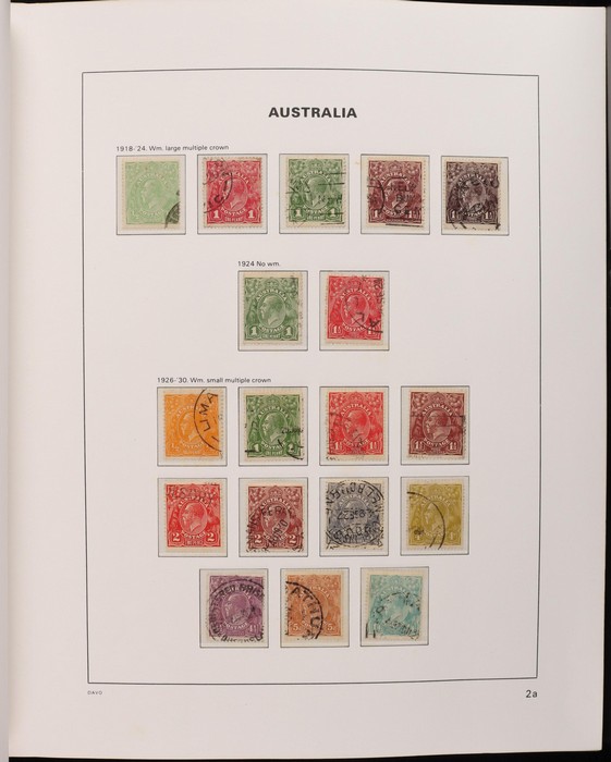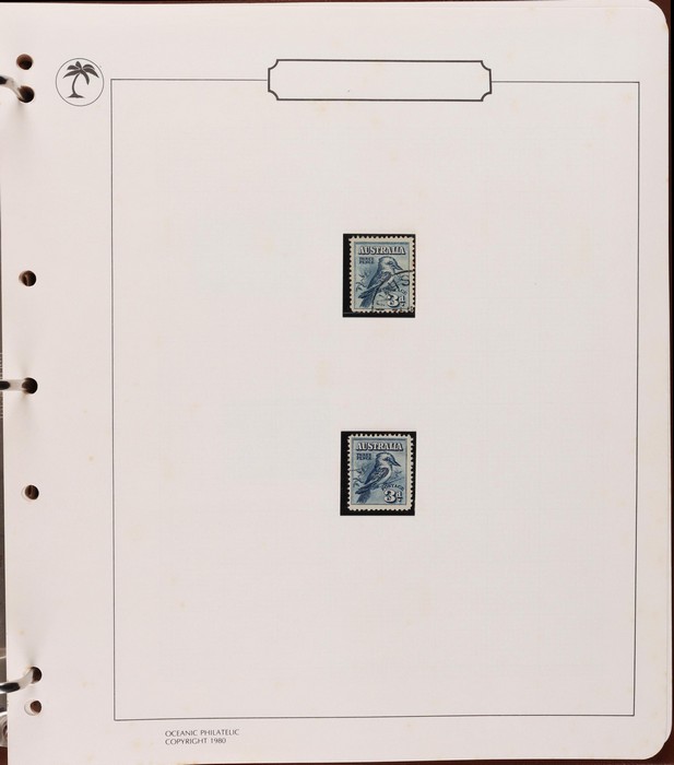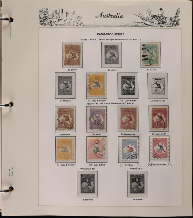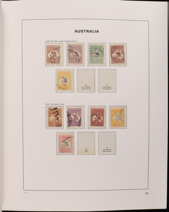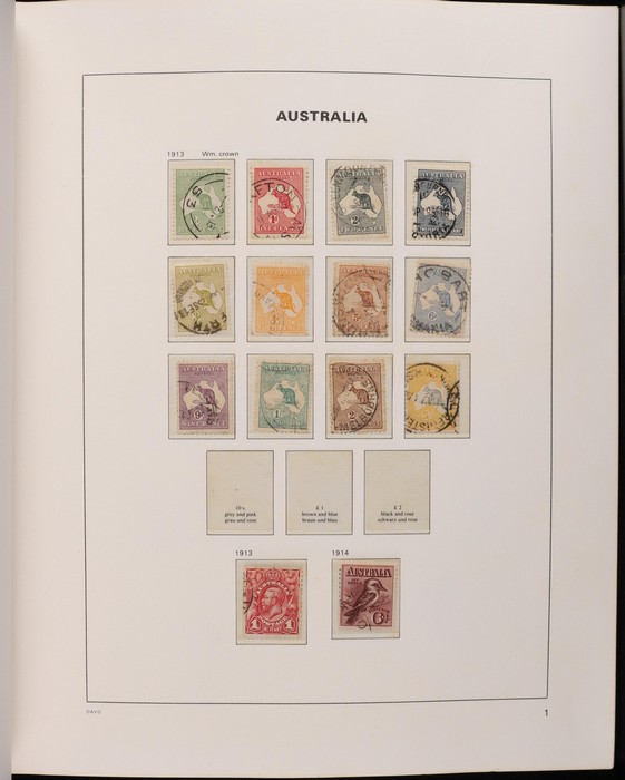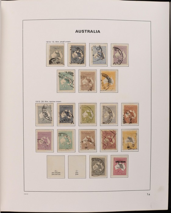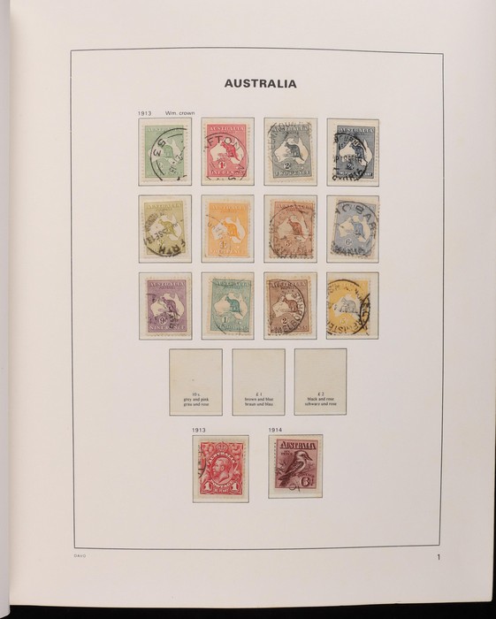 388 image1913-85 Extensive near comp collection in Davo Hingeless album with kangaroos 1st wmk ½d to 5/-, 2nd wmk set to 5/-, 3rd wmk to 5/-, plus £1 grey G-FU & £2 opt SPECIMEN type B MLH. SM wmk to 5/-, CofA wmk to 10/-. KGV Heads comp (56) to 1/4. 1914 Kookaburra 6d Engraved, 1929 3d Kooka M/Sheet, UN (thinned UR cnr), 1930s commems inc 1932 Bridge set to 5/-, 1934 Vic Cent Macarthur, 1935 ANZAC & KGV SJ sets, 1937 KGVI to £1 Robes, 1949 Arms set ,1964 Navigators set of 6 U, BCOF set of 7 (5/- thin paper), 2/-, 5/- U, OS opts inc 6d Roo SM + CofA wmks, 1931 Kingsford Smith pr & KGV to 5d. Decimals 1966 to 1985, AAT 1957 to 1984. Generally G-F/VFU. Retail $4500+. (1040) (P) (Image1) (Image2) (Image3) (Image4) (Image5) (Image6) (Image7) (Image8) (Image9) (Image10) (Image11) (Image12) (Image13) (Image14) (Image15) (Image16) (Image17)