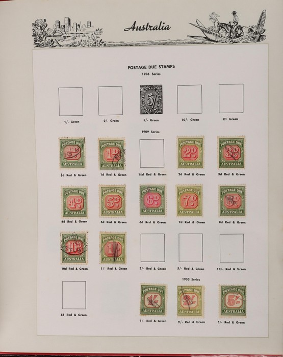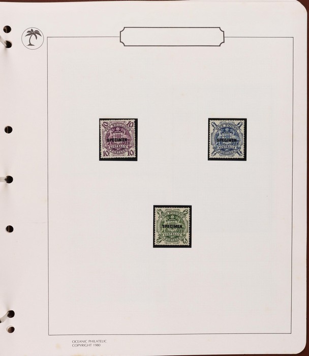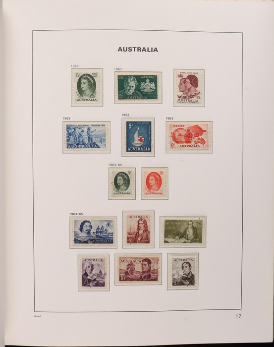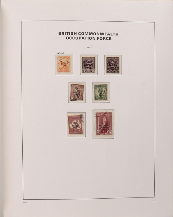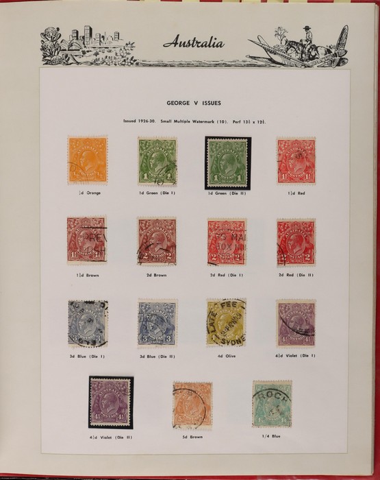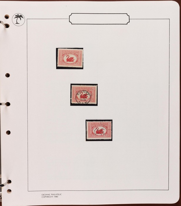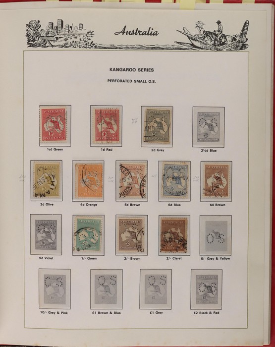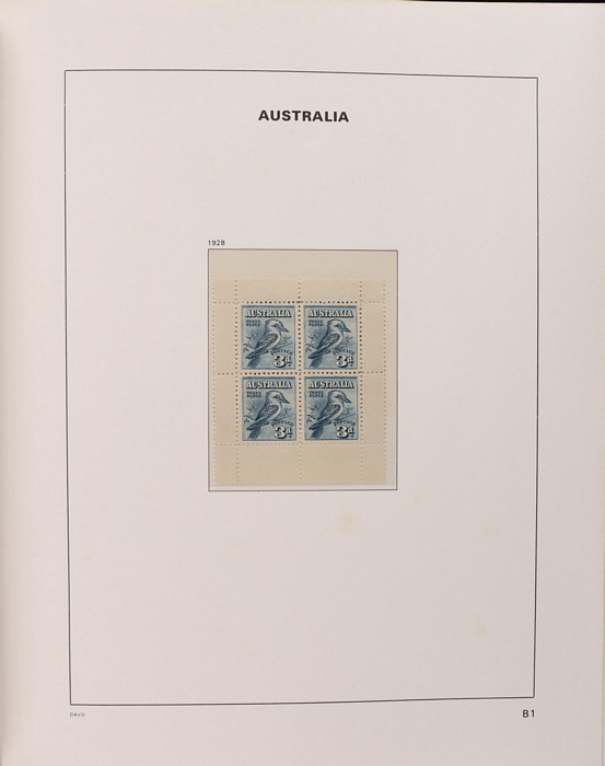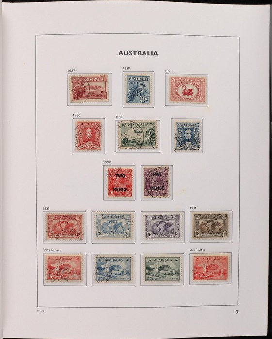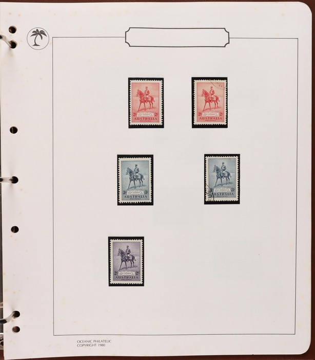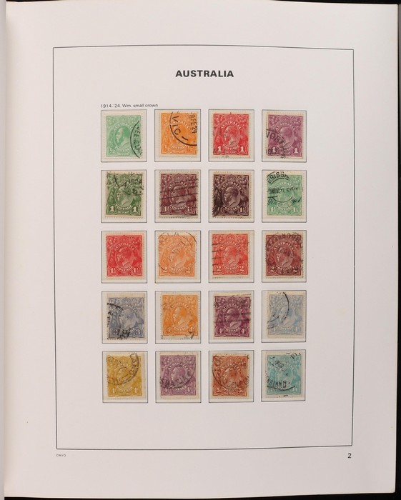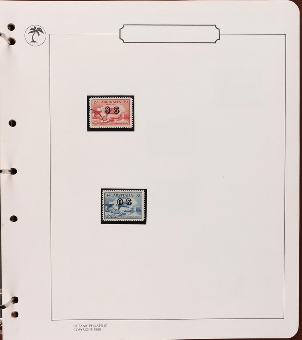 388 image1913-85 Extensive near comp collection in Davo Hingeless album with kangaroos 1st wmk ½d to 5/-, 2nd wmk set to 5/-, 3rd wmk to 5/-, plus £1 grey G-FU & £2 opt SPECIMEN type B MLH. SM wmk to 5/-, CofA wmk to 10/-. KGV Heads comp (56) to 1/4. 1914 Kookaburra 6d Engraved, 1929 3d Kooka M/Sheet, UN (thinned UR cnr), 1930s commems inc 1932 Bridge set to 5/-, 1934 Vic Cent Macarthur, 1935 ANZAC & KGV SJ sets, 1937 KGVI to £1 Robes, 1949 Arms set ,1964 Navigators set of 6 U, BCOF set of 7 (5/- thin paper), 2/-, 5/- U, OS opts inc 6d Roo SM + CofA wmks, 1931 Kingsford Smith pr & KGV to 5d. Decimals 1966 to 1985, AAT 1957 to 1984. Generally G-F/VFU. Retail $4500+. (1040) (P) (Image1) (Image2) (Image3) (Image4) (Image5) (Image6) (Image7) (Image8) (Image9) (Image10) (Image11) (Image12) (Image13) (Image14) (Image15) (Image16) (Image17)