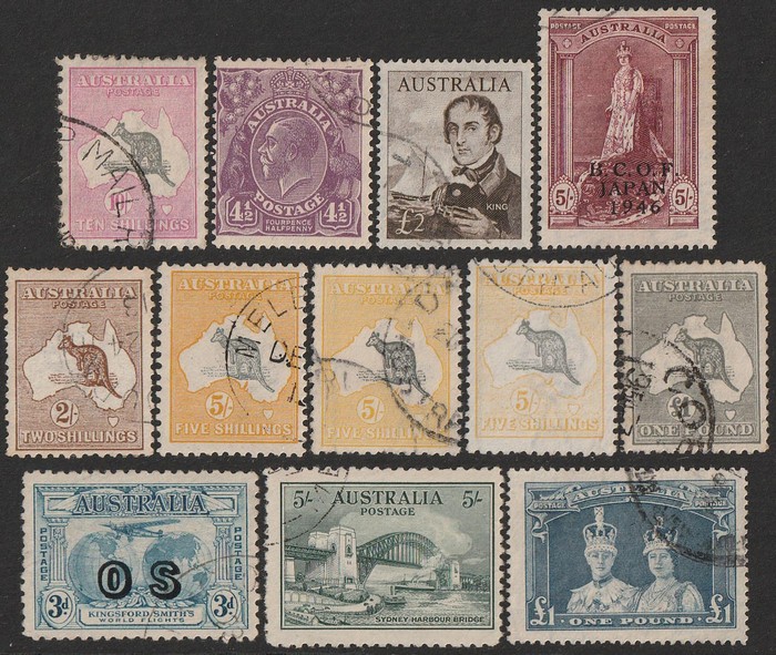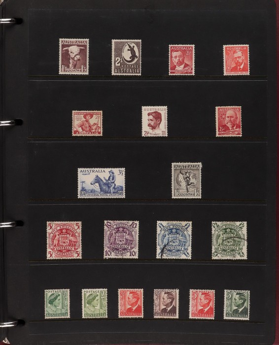 395 image1914-65 M/U collection with Kangaroos set to 5/- U inc 6d brown opt OS & short set of 5 to 3d olive M. KGV to 1/4 inc OS opts to 4d. 1914 Kookaburra 6d Engraved M & U. 1931 Kingsford Smith sets to 6d brown Airmail (2). 1934 VIC Cent sets (2), 1935 ANZAC 1/- M & U. 1935 KGV Jubilee sets to 2/- VFU & M. 1936 SA sets M & U. 1937 KGVI Robes 5/-, 10/-, £1. 1949 Arms to £2, plus 10/-, £1, £2 opt SPECIMEN. Comprehensive QEII to 1965 Christmas M & U inc Navigators to 10/- Flinders. Mostly F-VFM. ACSC cat/retail $1600. (540) (Image1) (Image2) (Image3) (Image4) (Image5) (Image6) (Image7) (Image8) (Image9)