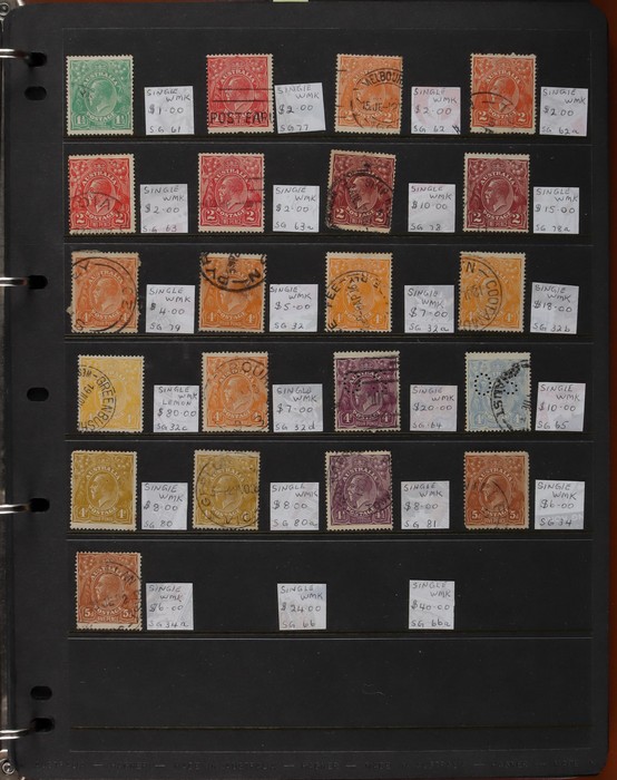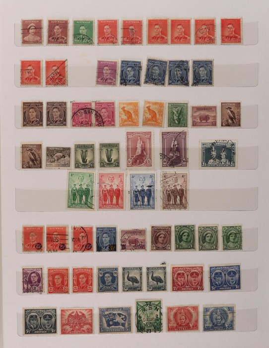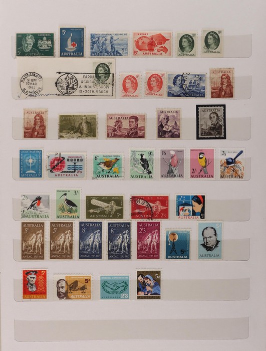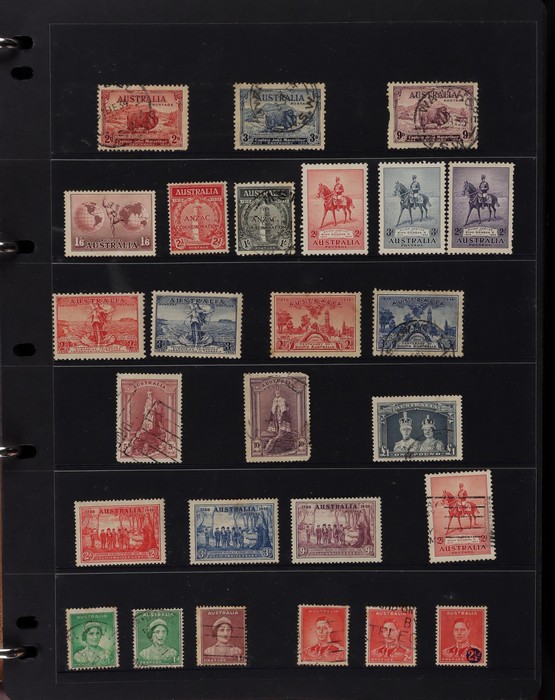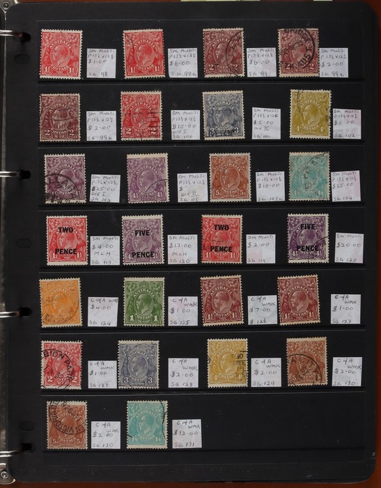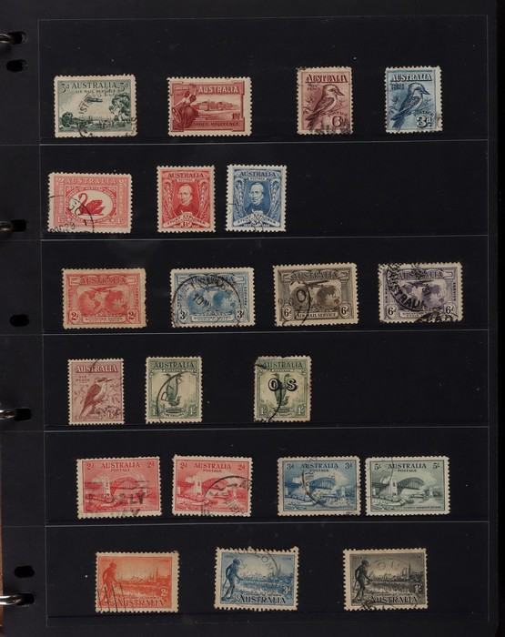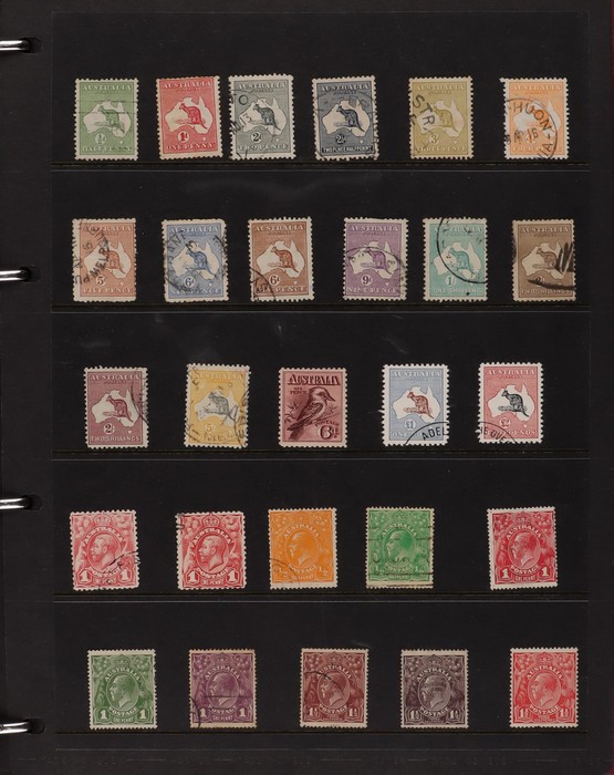 389 image1913-86 collection in 50 hagners with Kangaroos to 2/- brown inc small OS Perfins & 1st wmk large OS (8) to 1/- green. KGV to 1/4 inc OS opt set of 6 to 5d. 1914 Kookaburra 6d Engraved. 1930s Commems inc 1932 Bridge 5/- green, 1934 VIC Centenary set & 1935 ANZAC 1/- & KGV Silver Jubilee set to 2/- M. 1937 KGVI to £1 Robes, 1940 AIF set FDC, 1949 Arms to £2, 1963-64 Navigators to £2 inc 10/- & £1 (4) on Parcel piece. Decimals to end 1986 inc 1971 Christmas 7c blks of 25 (2) MNH & high val Pics/Commems to $10 Painting. Also Australian States (70) inc NSW QV Diadems. Some mixed condition, generally G-F/VFU, retail over $2300. (100s) (P) (Image1) (Image2) (Image3) (Image4) (Image5) (Image6) (Image7) (Image8) (Image9) (Image10) (Image11) (Image12)