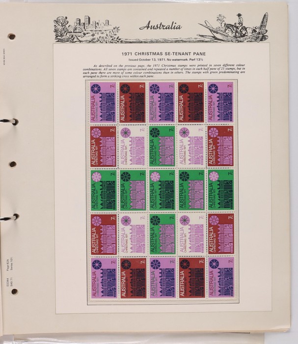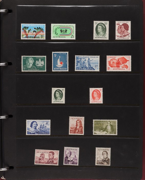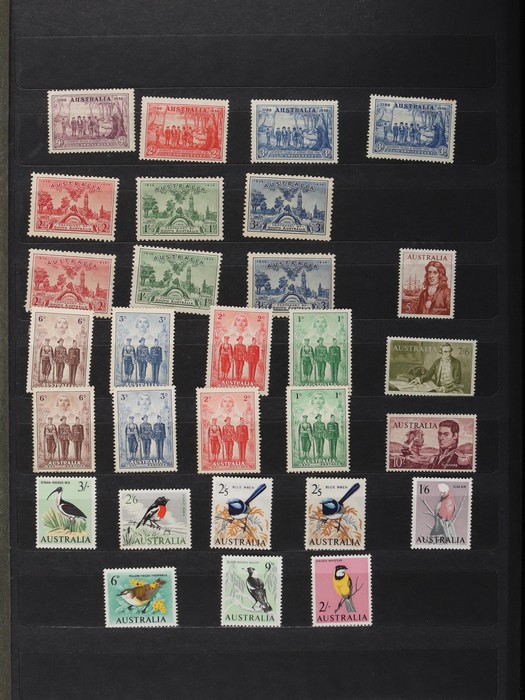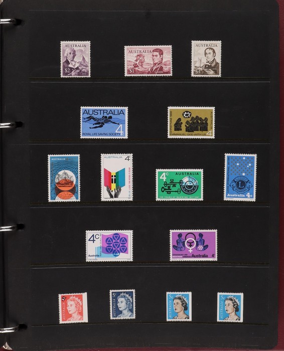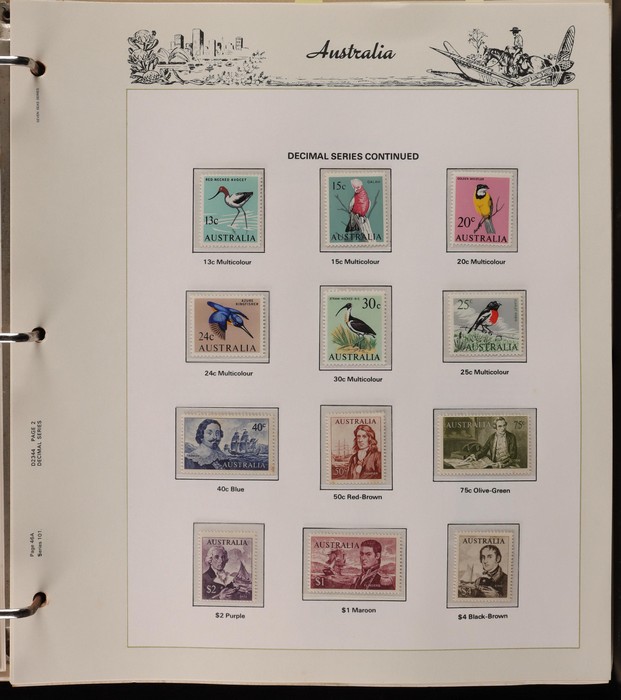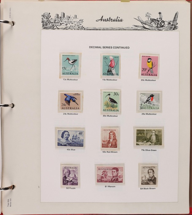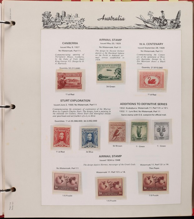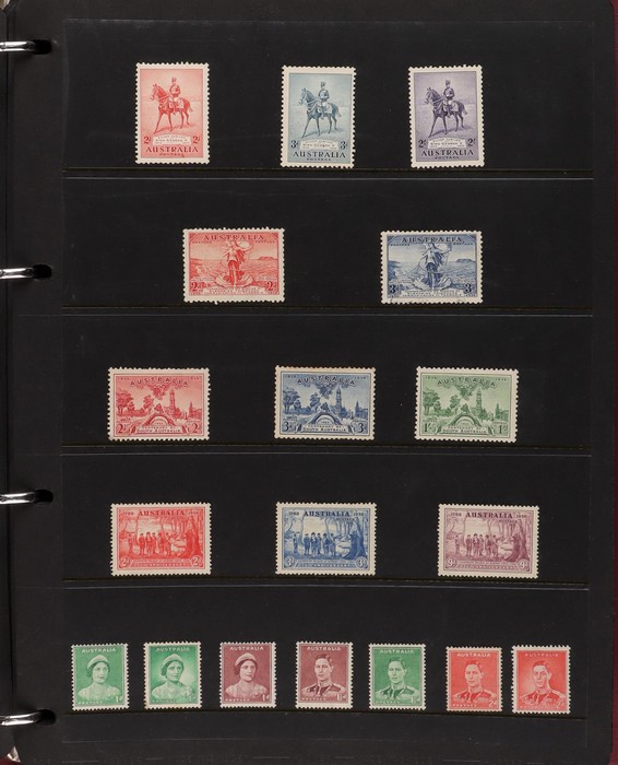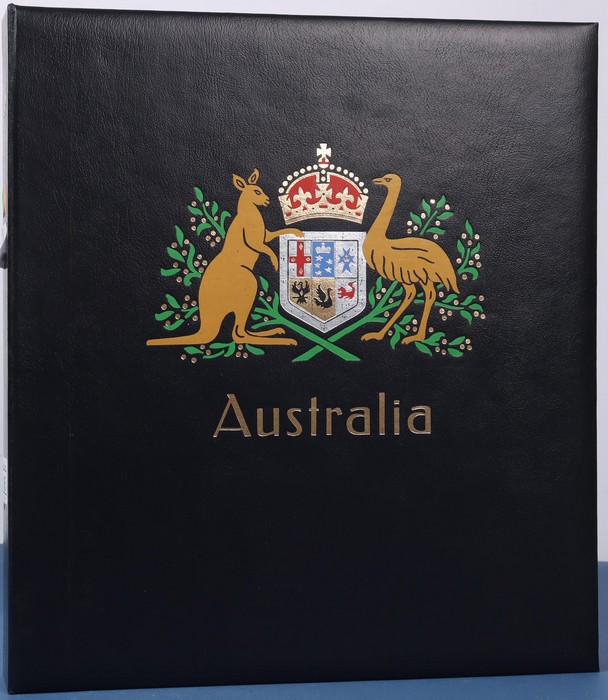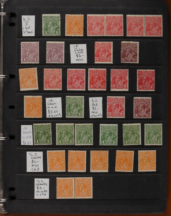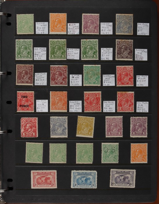 400 1914-80 M/MNH collection in Seven Seas album with Kangaroos 2nd wmk 1/- & 3rd wmk 6d blue VFM (ACSC cat $625). 1914-36 KGV Heads (22) inc single wmk 4d blue MNH, 4½d violet MLH & SM wmk 1/4 turquoise M. 1914 Kookaburra 3d Engraved MNH (cat $275). Then mostly MNH inc 1931 Kingsford Smith 2d, 3d opt OS (forged opts), 1932 Lyrebird 1/- (2) inc OS opt, 1934 VIC Cent & Macarthur (glazed gum) sets, 1934 Airmail 1/6 claret no wmk, 1935 ANZAC 1/- fresh MNH & KGV SJ to 2/-, 1937 KGVI set of 16 to 1/4 (3d blue Dies M). 1938 KGVI Robes thick/thin papers (UN/M). 1949 Arms to £2. QEII pre-decimals comp inc 1959 Pics to 5/- Cattle white paper & 1964 Navigator set of 8 to £2. Comprehensive decimals (FV $100) inc 1966 Defs to $4 King, all better 1971-75 Commem sets & Paintings to $10. Mixed M/MNH as noted, mostly VF M/MNH. ACSC cat $4400 to 1965 plus $300 retail for the decimals. (P)