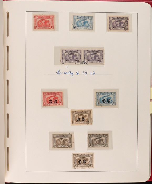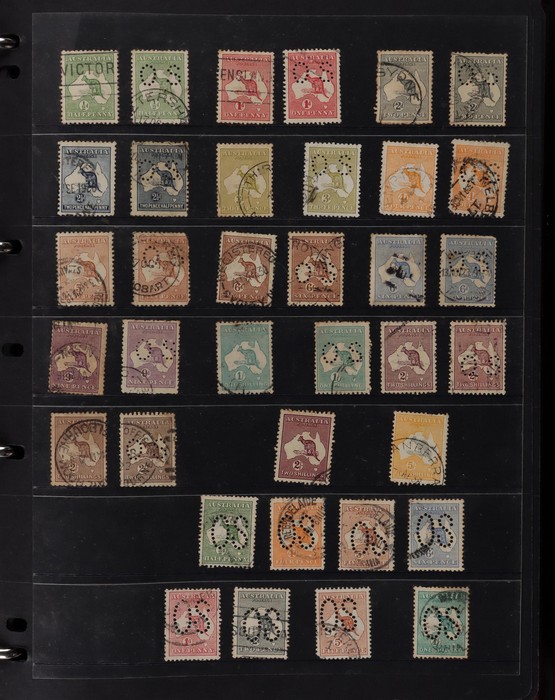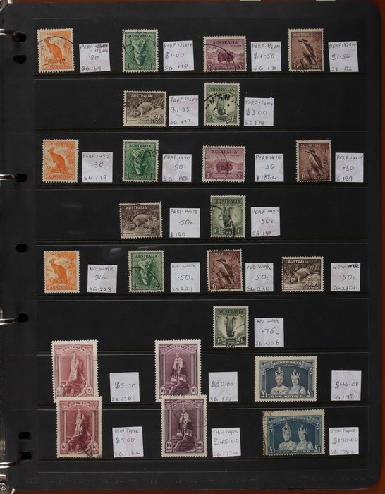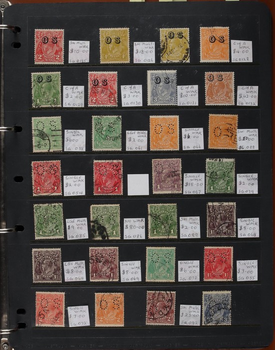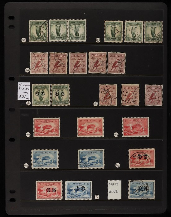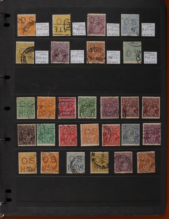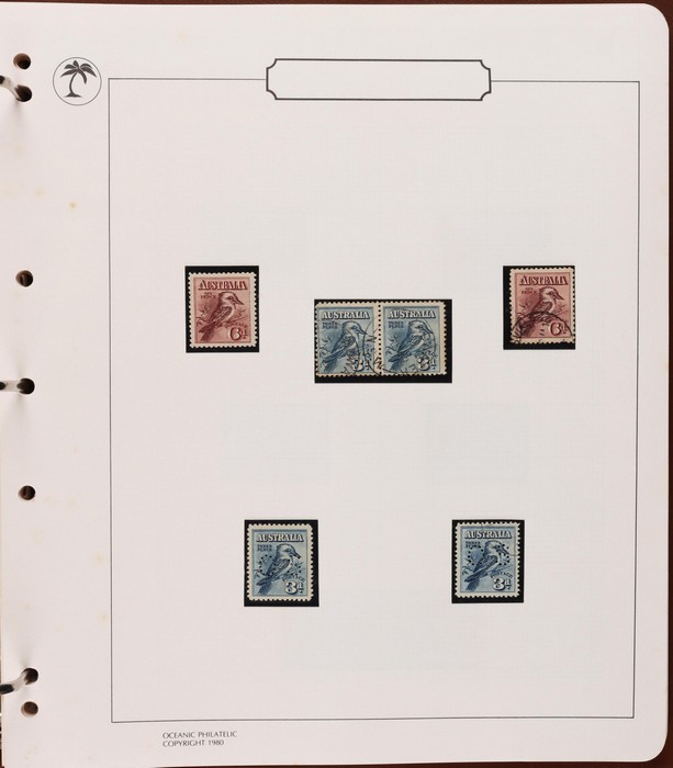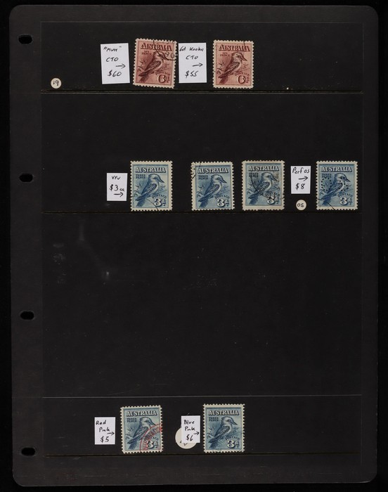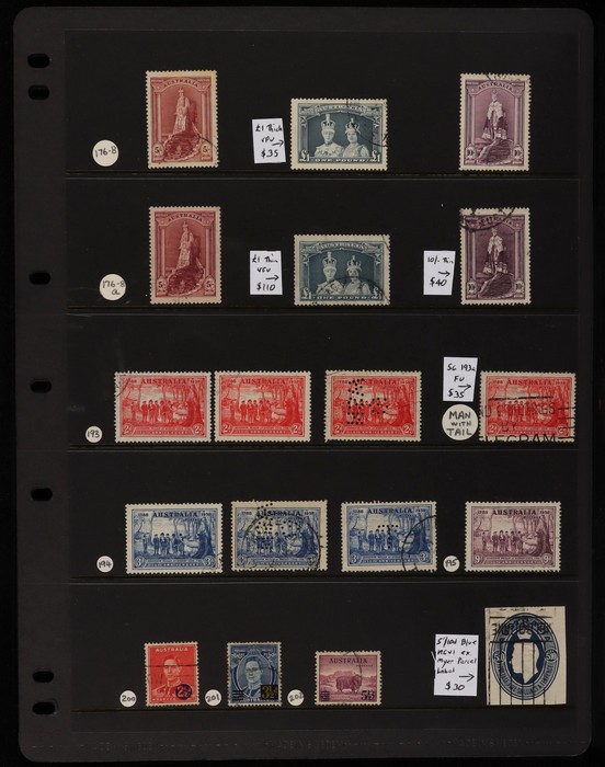 393 image1914-64 Pre-Decimals inc Kookaburra 6d Engraved (2), Kookaburra 3d blue (6) inc with red or blue Exhib pmks & a perf OS. 1927 Canberra (3) inc perf OS, 1929 Airmail 3d (6) & perf OS types A & B. WA Swan (5) inc perf OS, 1930 Sturt (2 sets) plus perf OS set. 1931 Kingsford Smith (2 sets), OS opts (2 sets) & 6d brown (3) inc opt OS, plus another 6d violet with 'extra islands'. 1932 Bridge 2d & 3d (2 ea) plus 2d type & OS pr. 1930 Lyrebird 1/- (6U) plus OS (2), Large Kooka (8U) inc perf G NSW (2). 1934 VIC Cent set of ea perf plus extra 2d & 3d inc private Perfins. 1938 Robes set both papers, NSW Sesqui set plus 'man with tail' G NSW perfin 2d & 3d plus 3d perf 'T'. Also 1937 KGVI 3d blue 'white wattles' & 11964 £2 Navigator & a few varieties also 1946 5/10 KGVI Food Parcel cut-out. VF U/CTO. ACSC cat $1660+ plus premium for all the scarce perfins. (105) (Image1) (Image2) (Image3) (Image4) (Image5) (Image6) (Image7)