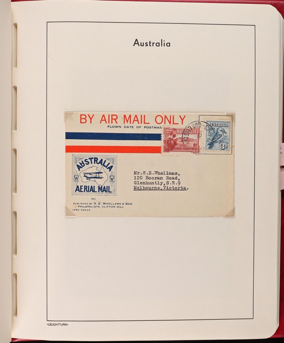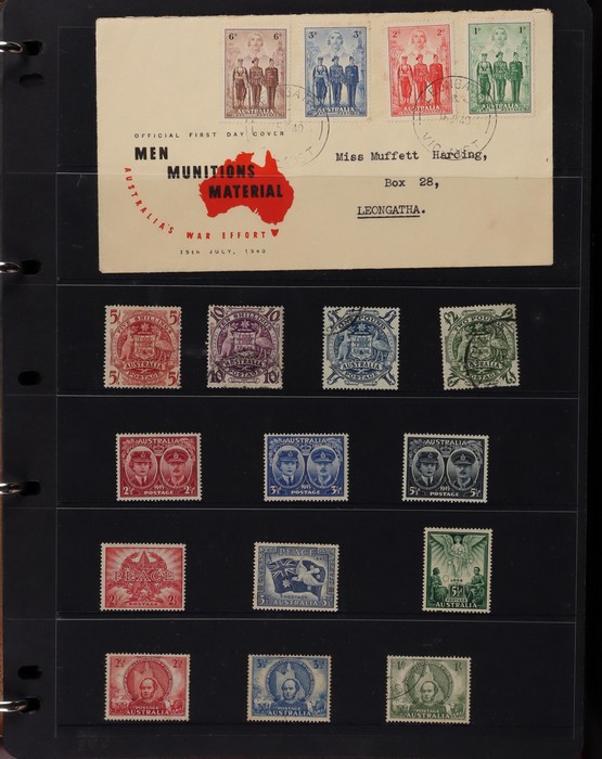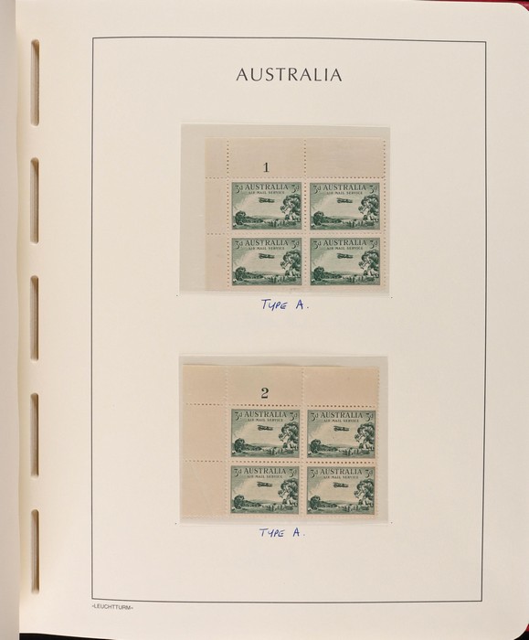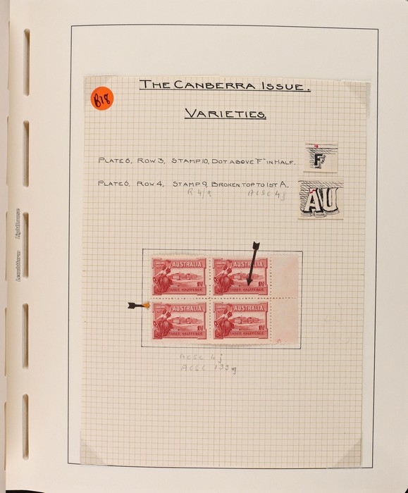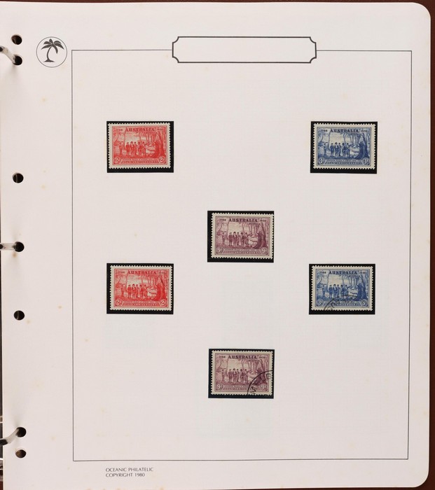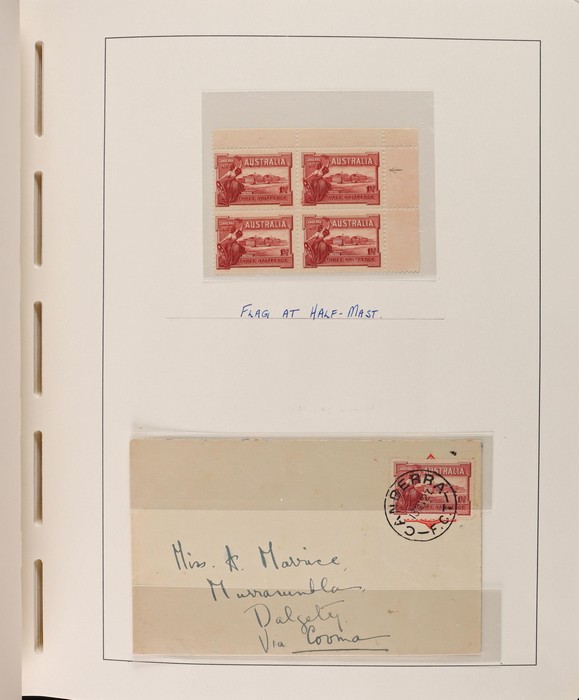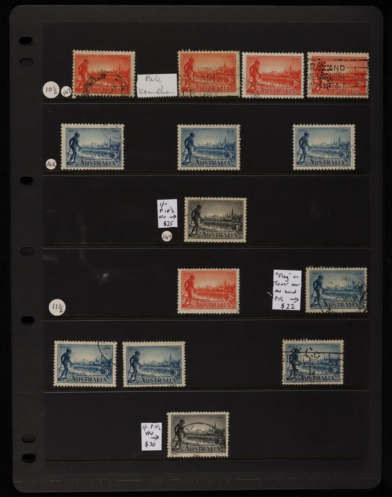 391 image1914-40s specialised collection of mainly commems in Lighthouse binder, with 1914 6d Engraved Kookaburra MNH & CTO. 1928-31 perf OS set of Commems M & U. 1928 Kookaburra M/Sheet M & U. 1931 Kingsford Smith OS set CTO, Airmail 6d brown M (3), OS (3), Bridge 5/- CTO, plus OS opts M & U. 1934 VIC Cent both perfs M & U, 1934 Macarthur M & U, 1935 ANZAC M & U, Silver Jubilee M & 4U, plus later issues inc 1937 Robes set to £1 thick & thin papers M & U. Inc a range of plate no singles & blks noted 1929 3d Airmail plate 1 & 2 blks, 1931 KS 2d & 3d all plates CTO, lots of varieties in positional pieces inc 1½d Canberra re-entry, flag at half mast & FDC, Swan 1½d re-entry, KS 6d re-entry, 6d extra islands, 2d Sesqui Cent man with tail etc. Various covers inc 1928 Exhibition single & pr FDI. Range of 1d green KGV advertising covers. Also 6d War Savings booklet with 18 stamps attached & petrol WWII ration coupon & BCOF set to 5/- M. Mostly VF fresh MLH/MNH, plus some G-VF U, odd condition problem allowed for in reserve. ACSC cat $10,200+. Very interesting & comprehensive collection. (400 + 80 covers) (P) (Image1) (Image2) (Image3) (Image4) (Image5) (Image6) (Image7) (Image8) (Image9) (Image10) (Image11) (Image12) (Image13) (Image14) (Image15) (Image16) (Image17) (Image18) (Image19) (Image20) (Image21) (Image22) (Image23)