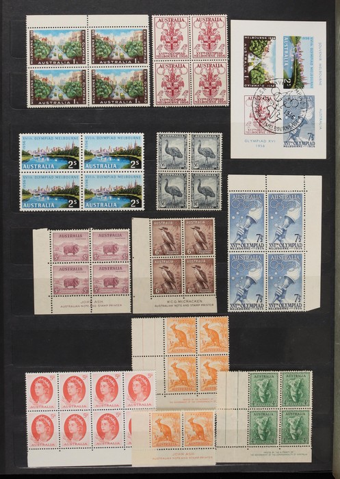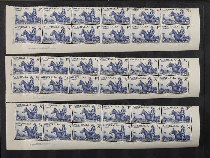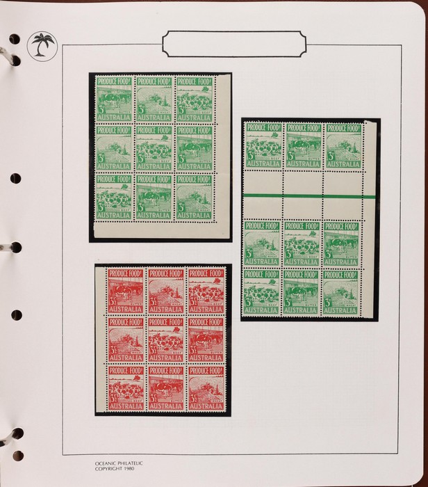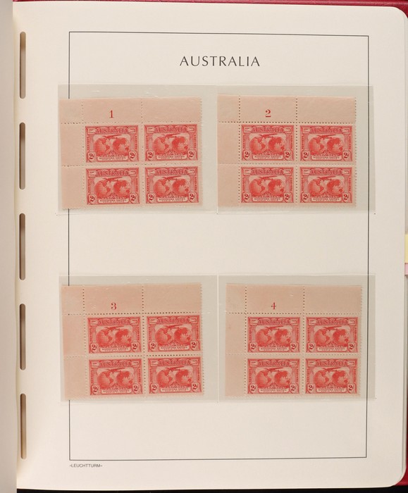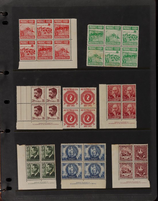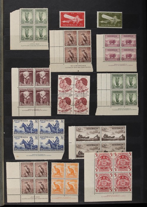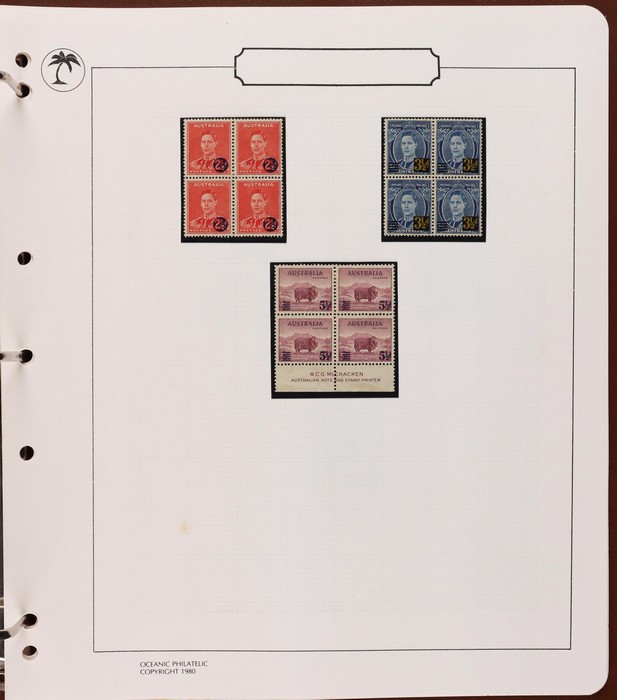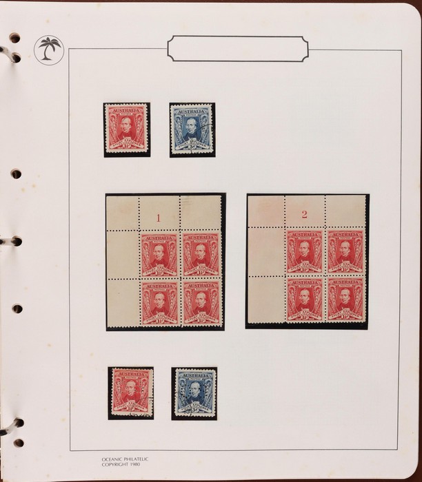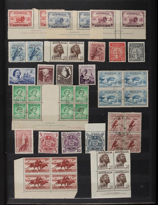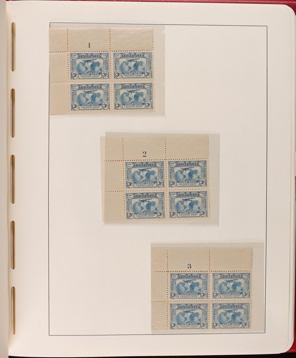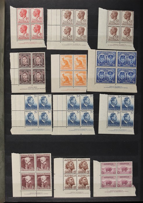 401 image1914-86 collection in hagner album with 1914 Kookaburra 6d engraved, 1931 Kingsford Smith sets M & U, 1932 Lyrebird 1/- opt OS, 1934 VIC Cent sets to 1/- (both) & Macarthur to 9d. 1935 ANZAC 1/- & 1936 Cable set Ash imprint blks of 4, cat $100, KGV Silver Jubilee set to 2/- U. 1936 SA & 1937 NSW Sesqui sets M & U. 1937 KGVI to 10/- M & Robes 5/-, 10/-, £1 VFU. 1949 Arms set to £1 FU, plus 10/-, £1, £2 opt SPECIMEN. 1940s-50s imprint blks of 4 (24) inc 1950 KGVI Defs to 2/6 Aborigine. 1952 KGVI 3½d brown, 1963 QEII 5d green & 1965 QEII 5d red 'exploded' booklets (cat $210). 1964 Navigator set to £2 & Birds to 3/-, plus decimals to mid 1980s inc Paintings to $10. M/MNH/U, generally F-VF, est cat/retail $1600. (970) (Image1) (Image2) (Image3) (Image4) (Image5) (Image6) (Image7) (Image8) (Image9) (Image10) (Image11) (Image12) (Image13)