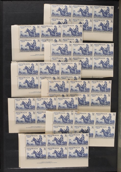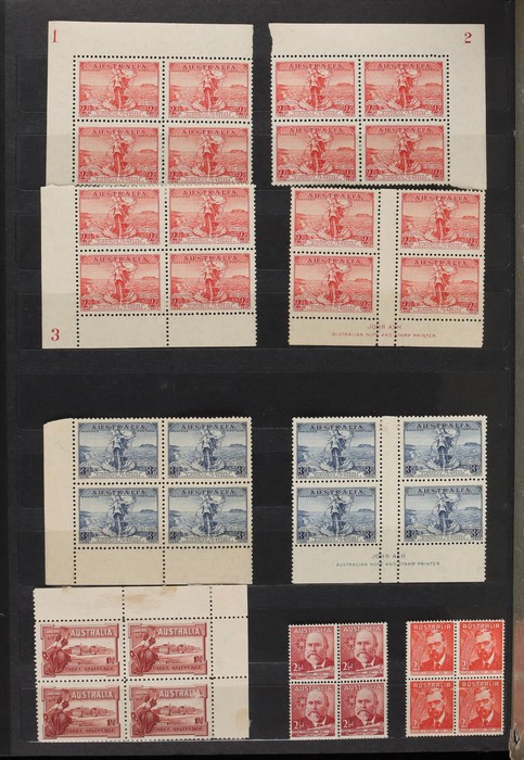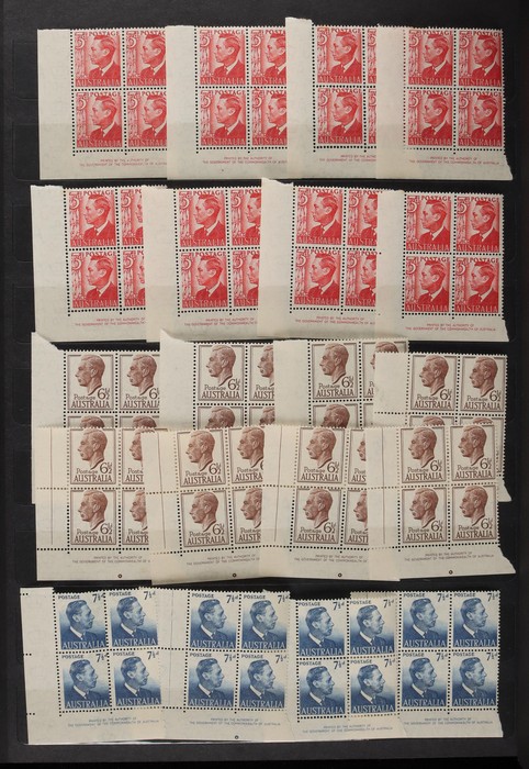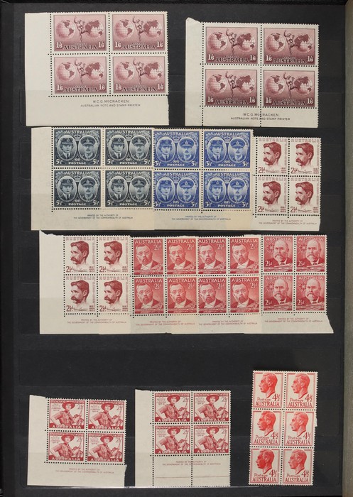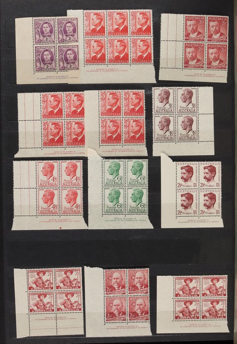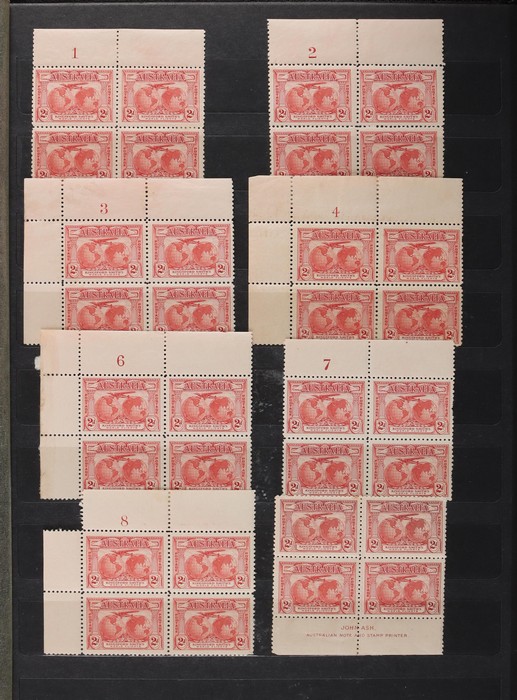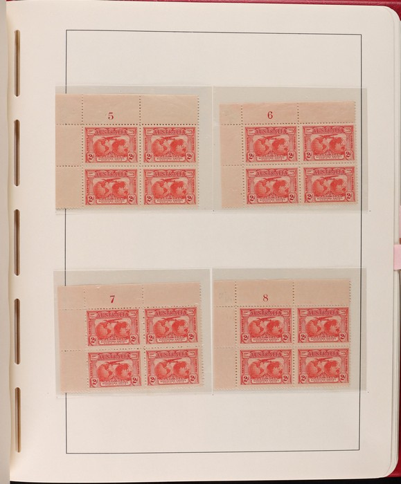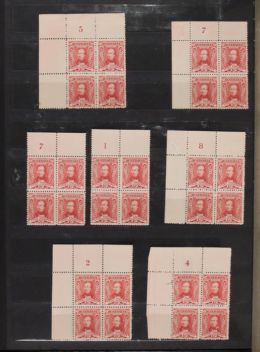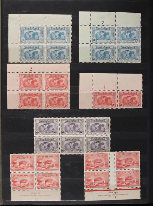 397 image1914-67 disorganised M/MNH collection in KEK s/book with 1914 Kookaburra 6d Engraved, 1930 Sturt 1½d plate number blks (7), 1931 Kingsford Smith 2d plate numbers (8) plus imprint blk of 4, 3d plate 3 & 1 blks of 4 & 6d violet blk of 6. 1932 Bridge 2d imprint blks of 4 (2 diff). 1934 Macarthur trio to 9d Ash imprint prs M. 1936 Cable 2d plate numbers 1, 2, 3 blks of 4 plus 2d, 3d imprint blks. 1936 SA to 1/- & 1940 AIF to 6d M (2 sets of ea), 1940s-50s imprint blks (80) mostly MNH with vals to 5/- inc 1/6 claret Hermes McCracken imprints thick & thin papers (cat $150), 1949 UPU 3½d blks of 12 (11), 2½d Commems & KGVI Defs to 2/6 Aborigine. Then others inc 1949 Arms to £1& 1964 Navigators set to £1 VFM & 1966-67 QEII booklet pane set of 13 MNH (retail $225). Odd U blk sighted then mostly F-VFM/MNH, total ACSC cat/retail $2500. (Image1) (Image2) (Image3) (Image4) (Image5) (Image6) (Image7) (Image8) (Image9) (Image10) (Image11) (Image12) (Image13) (Image14) (Image15) (Image16)