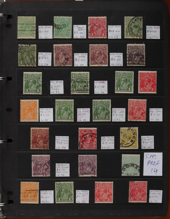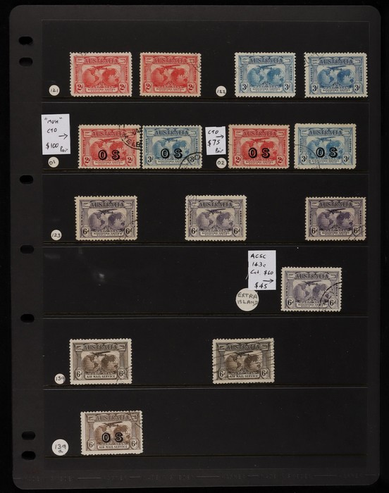 402 image1915-51 collection inc KGV (240) to 1/4 with 1d red (25) inc brown-red shade (ACSC 71o cat $250), Die II rough paper (3, cat $90) & 1d carmine LM wmk. SM wmk perf 14 2d, 4d & 1/4 turquoise. SM wmk perf 13½x12½ to 1/4 inc 4½d Die II. CofA wmk set to 1/6, OS opt set to 5d brown, perf OS to 1/4 turquoise inc scarce 4d lemon (cat $400) & perf OS/NSW (20) to 5d brown. Then 1937 KGVI set to Robes £1, 1949 Arms to £2 plus Pics/Commems to 1951 Federation inc 1914 Kookaburra. 1927-29 Commems perf OS (5) to 3d Airmail, 1931 Kingsford Smith 2d opt OS, 1932 Lyrebird 1/- opt OS, 1934 VIC Cent sets (2) & Macarthur to 9d, 1935 ANZAC 1/- & KGV SJ set to 2/-, 1936 SA & 1937 NSW sets, 1940 AIF to 6d plus others. Variable condition, generally G-FU. ACSC cat $3250. (470) (Image1) (Image2) (Image3) (Image4) (Image5) (Image6) (Image7) (Image8) (Image9) (Image10) (Image11) (Image12) (Image13) (Image14) (Image15) (Image16) (Image17)