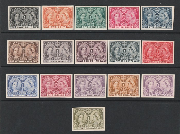 ½c-$5, imperf proofs on card. Superb UN as made, all 4 margins. SG 121-40(p) cat £6000 for normals, Unitrade 50-65(p) cat C$7000. Beautiful & rare set. (16) (P)