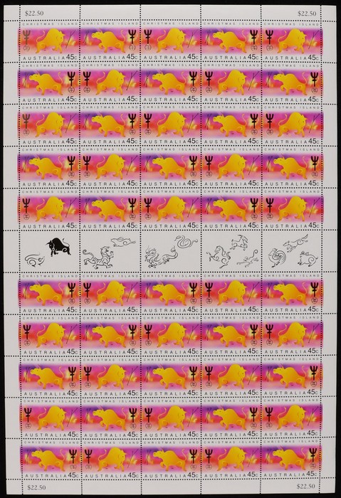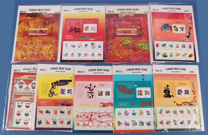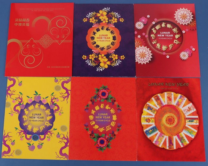 Year sheetlet packs for 2006-7, 12-13, 15 & 17-20, plus 12-Year Cycle folders 2007, 09-10, 13 & 19. Also China Joint Issue 2020 with Christmas Is sheetlet & China sheetlet of 16 (2). FV alone $112, plus China. (14 folders) (Image1) (Image2)