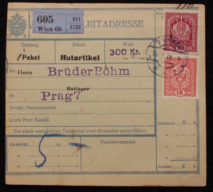 from Austria franked Crown 10h & 1K tied by 'Wien 14 12 18' cds, reverse with Crown 5h pr h/s PORTO tied by 'Praha 19 XII 18' cds to pay delivery fee. Rare provisional Postage Due use. (Image1) (Image2)