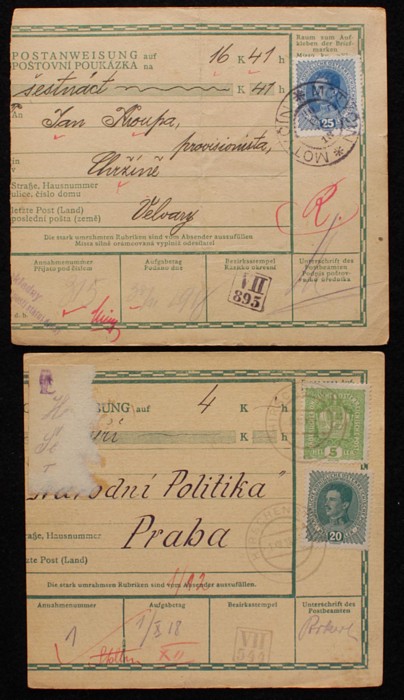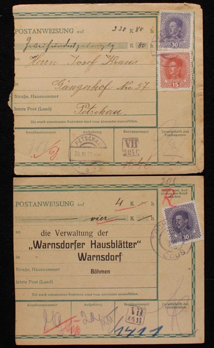 cards with all diff frankings of Austria Karl or Crown types inc 5h, 10h, 15h, 20h, 25h, 30h, 40h & 50h singly or in combinations & also a range of diff forms. Pmks inc Moravany, Hohenfurth, Teschen, Horni Jeleny, Wolfersdorf, Milesov u Sedlcan,