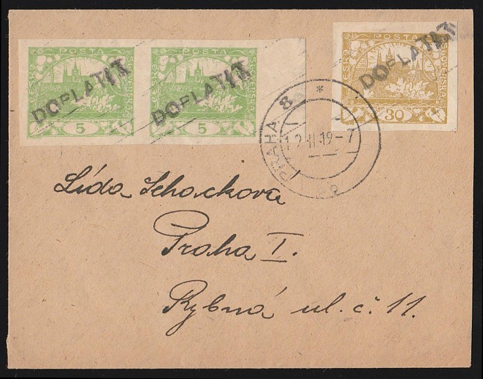 Hradcany 5h pr & 30h, ea h/s DOPLATIT, tied by 'Praha 12 II 19' cds. Scarce Postage Due provisional. (Image1)
