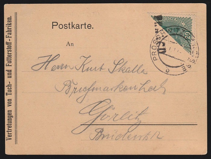 postcard franked Austria Karl 20h diag BISECT (LR half) tied by FRANCO h/s & 'Proschwitz a d Niesse' cds. Scarce provisional. (Image1) (Image2)