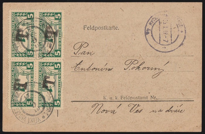 Feldpostcard sent stampless with 'Rych.nof 16 1 19' cds, franked Austria Newspaper express 5h blk of 4, ea with h/s 'T' tied by 'Velka Vesces Sev Dr 17 1 19' cds. Rare Postage Due provisional. (Image1)
