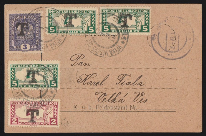 Fieldpostcard sent stampless with indistinct cds, franked Austria Newspaper stamps 2h & 5H (3), plus Crown 3h, all with h/s 'T' tied by 'Velka Vesces Ces Sev Dr 17 1 19'. Rare Postage Due provisional. (Image1) (Image2)