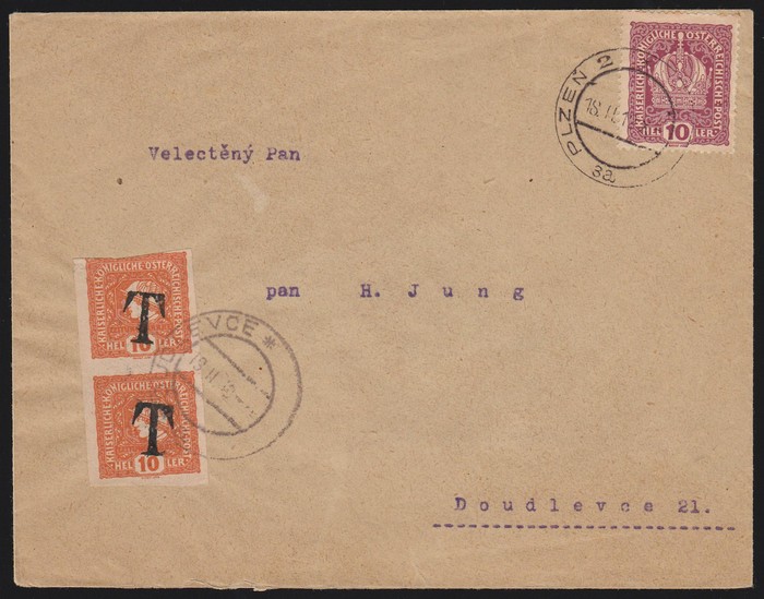 Austria Crown 10h tied by 'Plzen 18 II 19' cds but underpaid, with Austria Newspaper Stamp 10h pr with 'T' h/s tied by 'Doudlevce 19 II 19' cds. Rare provisional Postage Due.