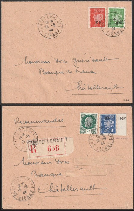 'RF' opt Petain 1F, plus 'Arc' defins 5c (2) & 10c (4), plus opt Petain 1.50 single franking, tied by 'Chantellerault 19 (or 20) 10 44' hexagonal pmks. Yv 4 & 6. Mayer 4 & 6 cat €320. (2 covers) (Image1)