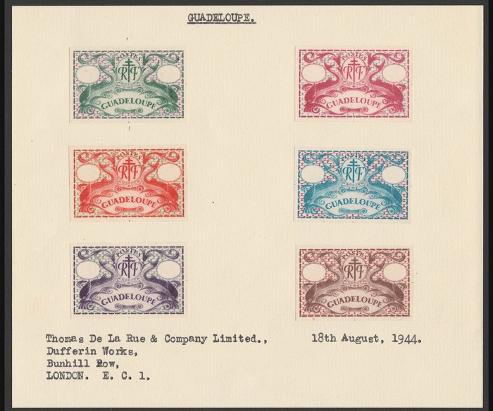 set 10c-20Fr, IMPERF proof colour trials. VF UN as made, all 4 margins, mounted on De La Rue archive pg dated 14 November 1944 which has folds & dirty as was printer's working proof, with notations that colours are approved but values are to be