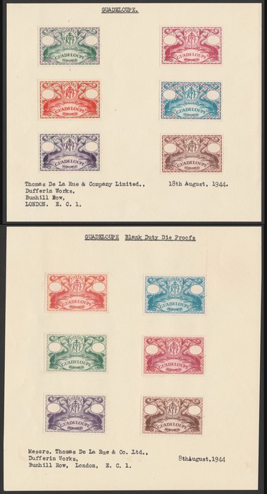 F Cross of Lorraine, imperf blank duty DIE PROOF set of 12 diff colour combinations with OMITTED value tablets. Superb M/UN as made, all affixed on 8 & 18 August 1944 pieces from Thomas De La Rue archive pgs, all 4 margins. SG 183-201(p). Yv