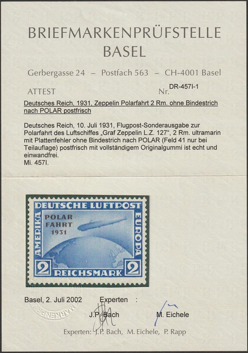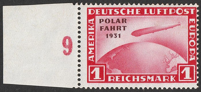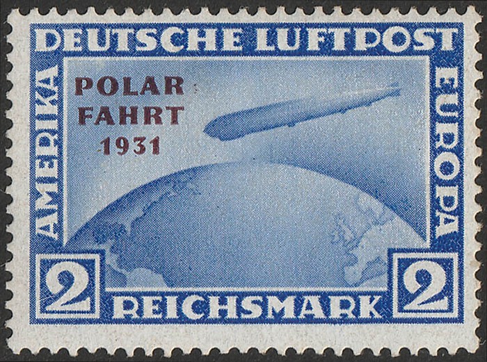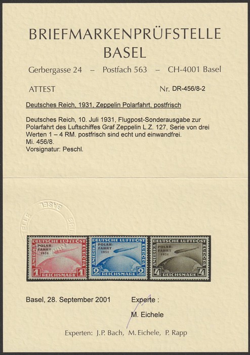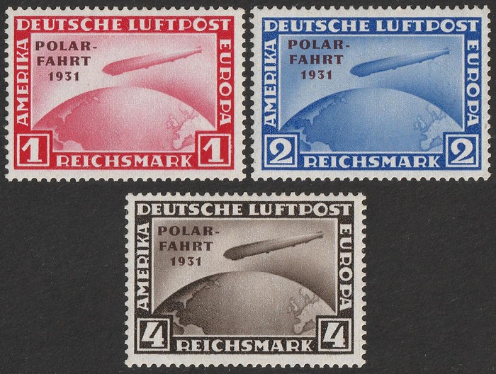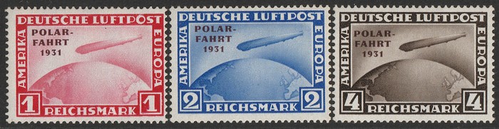 opt Zeppelin set 1RM-4RM with 'POLAR FAHRT 1931' opt. VF fresh MNH with never hinged original gum which is somewhat glazed. SG 469-71 cat £1175 for M, should be at least double, £2350 MNH. Mi 456-58 cat €4400. 2001 Eichele