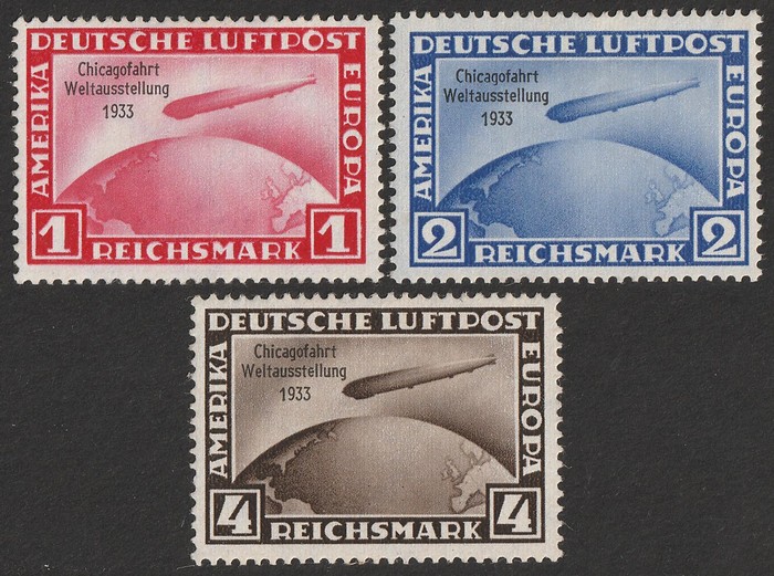 opt Zeppelin set 1RM, 2RM & 4RM with 'Chicagofahrt Weltausstellung 1933' opts. VF fresh M/MLH. Mi 496-98 cat €1200. SG 510-12 cat £1300. Scarce genuine set. (3) (P)