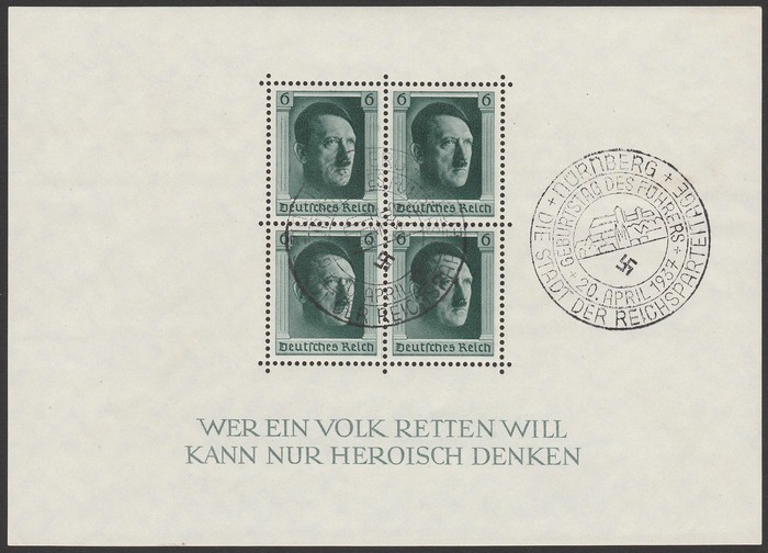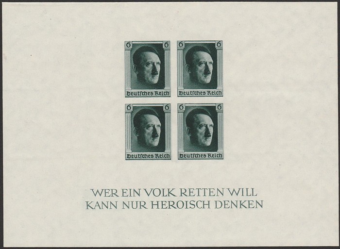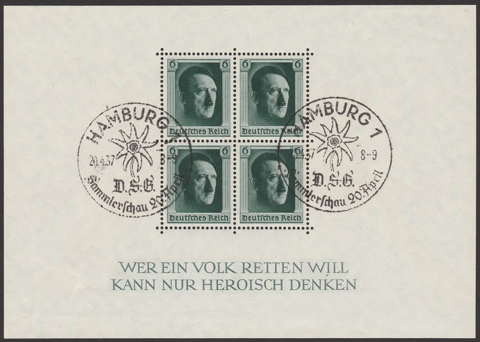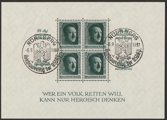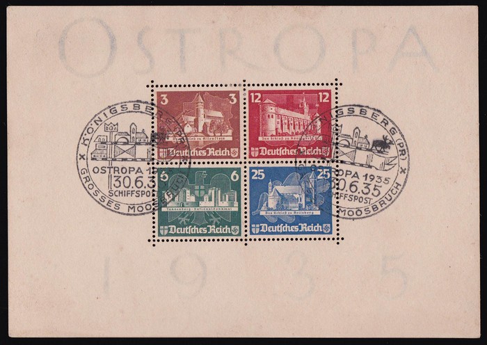M/Sheet. Superb U, with 'Konigsberg Ostropa 1935 30.6.35 Schiffspos Grosses Moos Bruch' special pictorial shipmail pmk. Scott B68 cat US$825, Mi Blk 3 cat €900++, SG MS576a cat £1400++, plus premium for rare pmk & unusually nice condition.