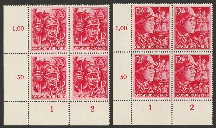 Troopers set 12+38pf in LL cnr blks of 4. VF fresh MNH. SG 897-98 cat £436. Mi 909-10 cat €360. (2 blks) (P) (Image1)