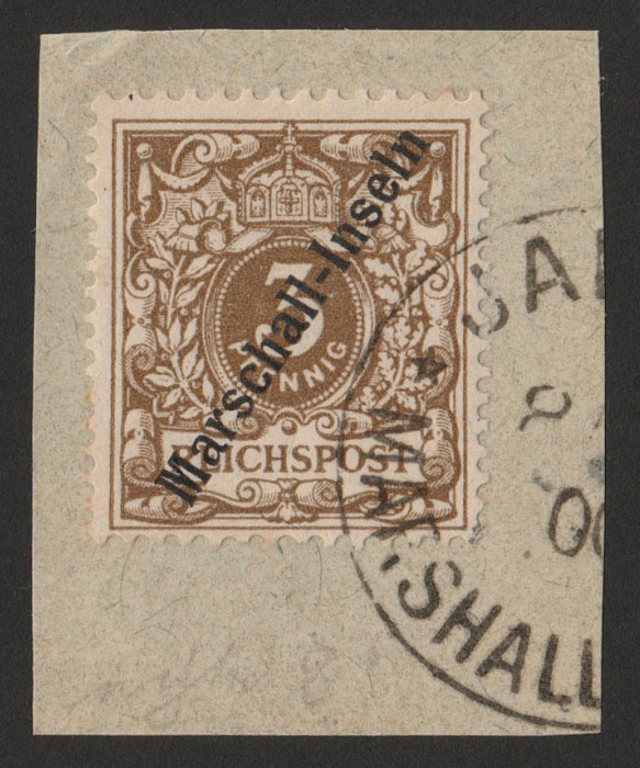Marschall-Inseln opt 3pf grey-brown, Berlin issue. VFU, tied to piece by 'Jaluit Marshall Inseln' 1900 cds. SG 1 cat £3000. Mi 1II cat €850 with this cancel. (P)