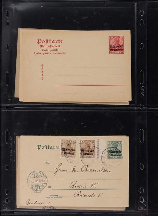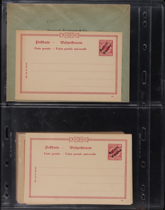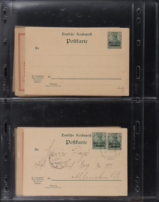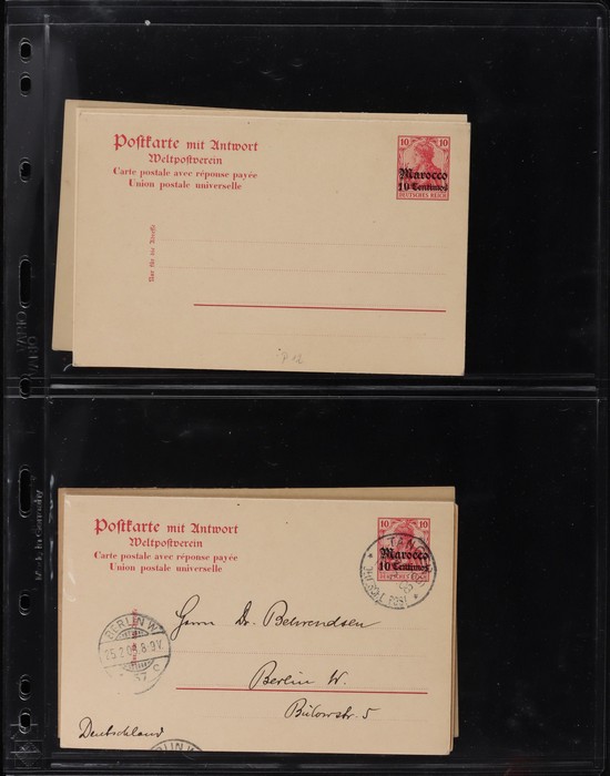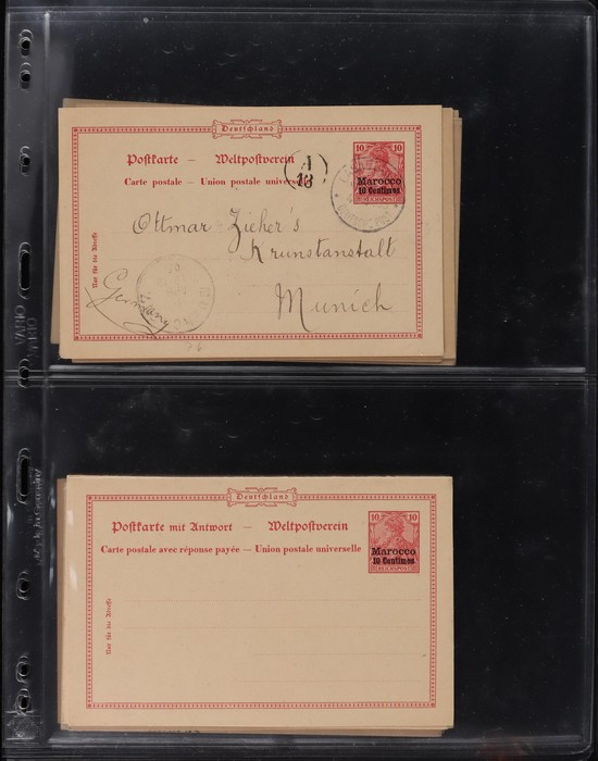 1899-19 Postal Cards with 1899 2-line diag opts 5pf UN, 10pf UN/U, 10+10pf Double Reply. 1900 Reichspost 5+5c Double card UN & U, 10pf U, 10+10c Double 2, inc rare opt Specimen (Mi cat €250). 1905 Germania opts 5c UN, 10c 2 UN, 5+5c uprated U,