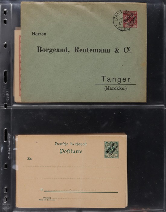10c Double UN & U, 1911 5pf UN & U, 1917-18 5c Divided Face & unlisted 10c+10c Double card UN. Plus PTPO Envelope 2-line diag opt 10c/10pf VFU Tanger 31 5 01 cds. Mi cat €750+. (21) (Image1) (Image2)