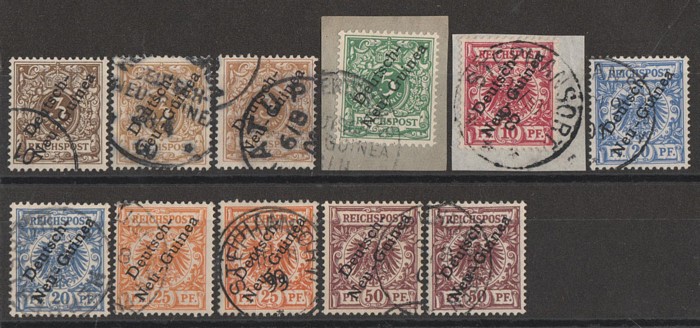 opt set 3pf-50pf, plus extra shades of 3pf (2), & 20pf-50pf. VFU, range of diff pmks, most expertised. SG 1-6 cat £800. Mi 1-6 inc 1b, 1c & 5b cat €730. (11). (P)