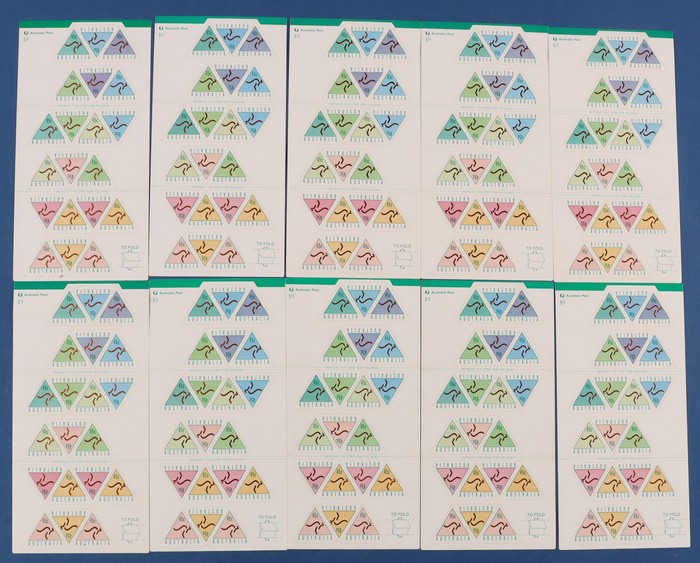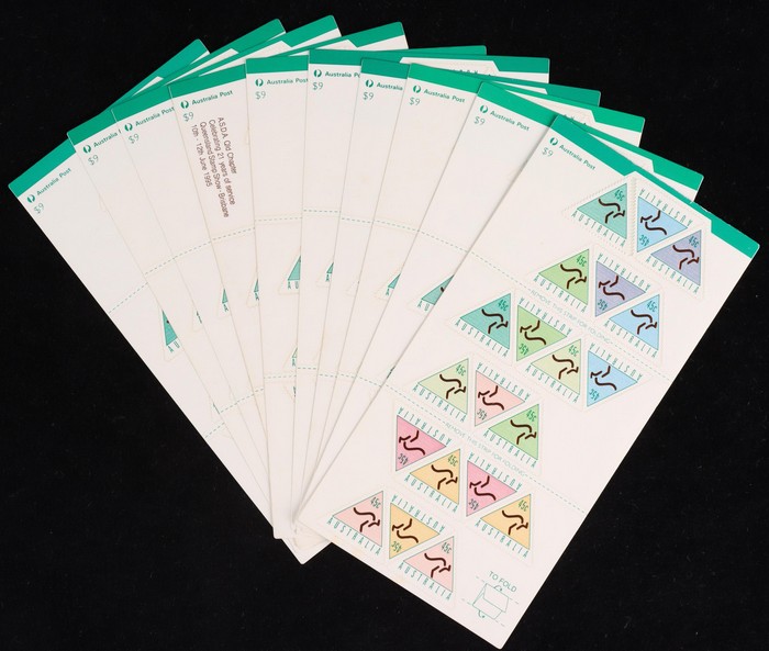 Indonesia-Australia Joint Issue booklets with pane of ten 300Rp Cuscus stamps, fresh MNH. Scarce type I pane 76x234mm. SG SB18 cat £875 = A$1750 for common type. Pfr B186 cat $100 ea is $10,000+. (100) (Image1)