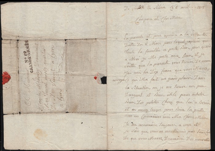 paid) with 'No.67 PORT-PAYE GRANDE ARMEE 2-line pmk & '9' m/s postage rate on reverse, plus red wax seal on back. Rare historical letter. (P) (Image1) (Image2)