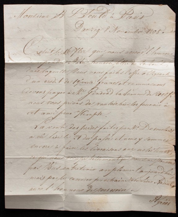 'Grand Armee' occupation of Danzig (Gdansk, previously in Kingdom of Prussia, then Free City of Danzig under Napoleon, now in Poland). Folded letter headed 'Grande Armee Place de Dantzig 5 gbre 1807' sent by Board of Heating & Light with 'No.59